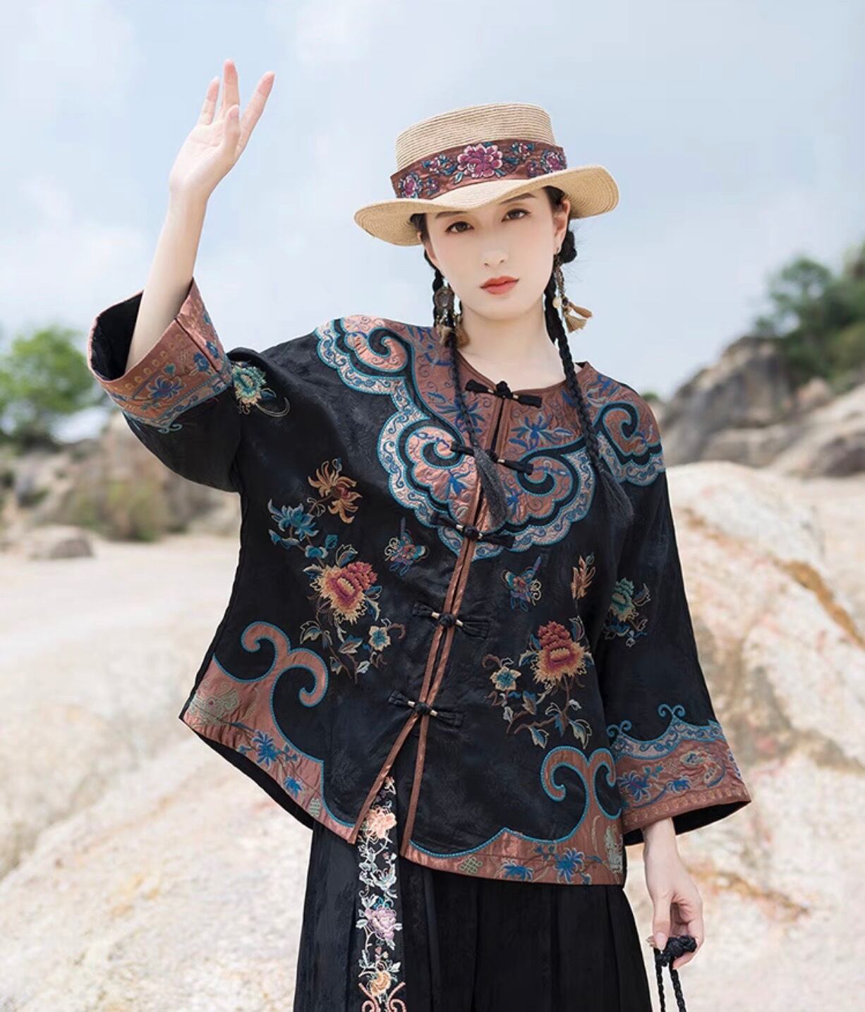 チャイナ服 トップス 本格 凝った刺繍 華やかな風合い 七分袖 襟なし ゆったりシルエット チャイナボタン 二胡衣装 装飾チャイナ zt630