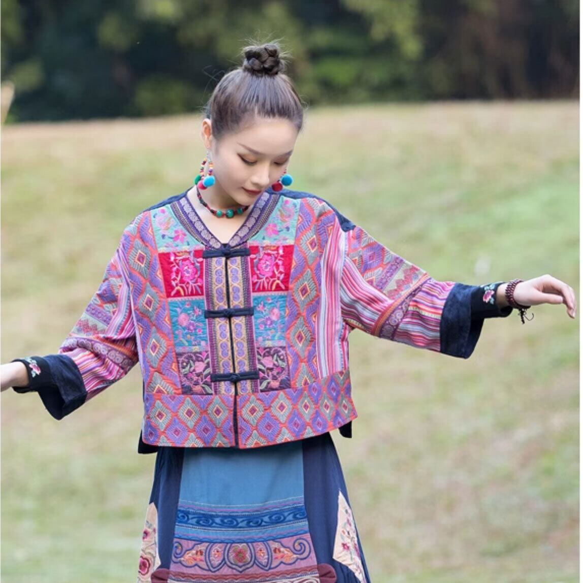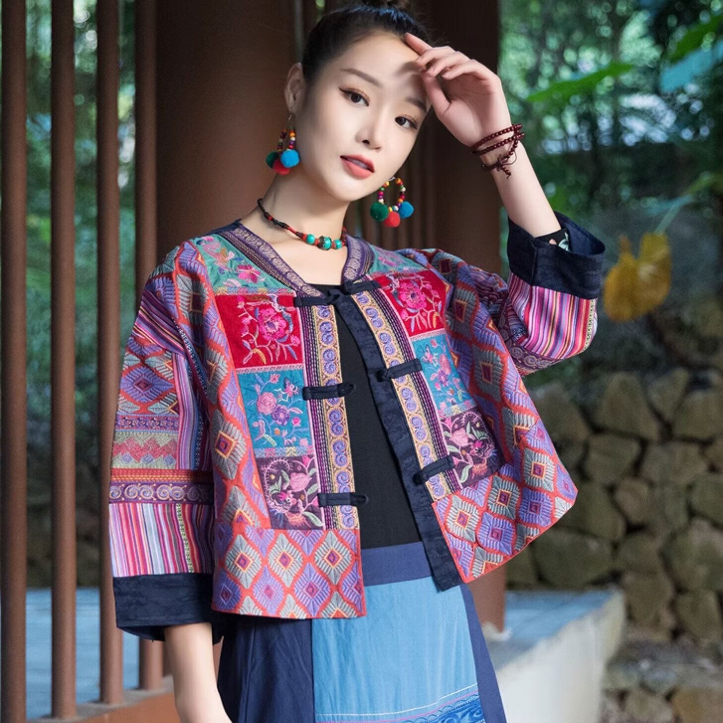 チャイナ服 トップス 本格 凝った刺繍 パッチワーク風 羽織 七分袖 襟なし ゆったりシルエット チャイナボタン 二胡衣装 装飾チャイナ zt633