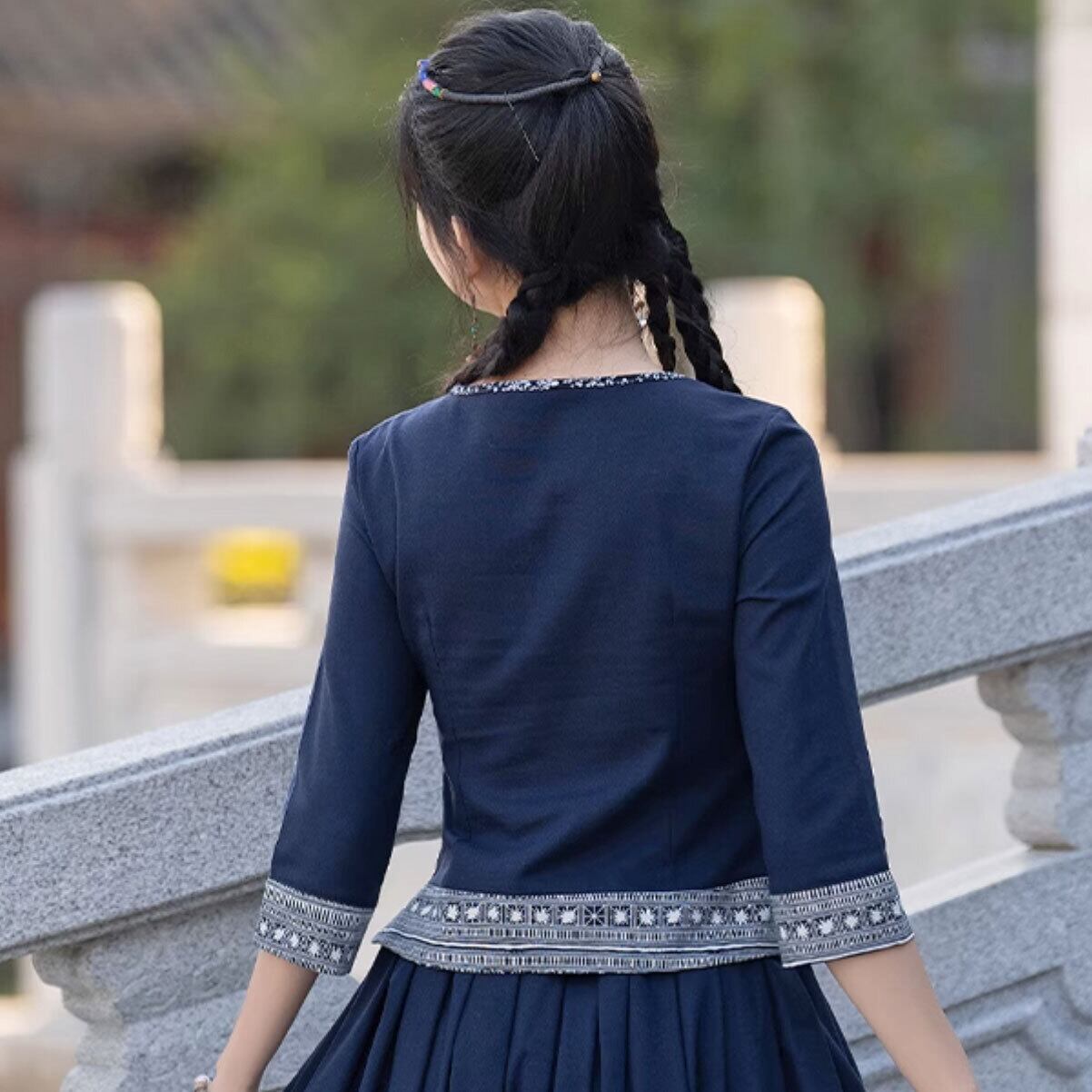チャイナ服 トップス 春夏 七分袖 民族模様 襟なし 落ち着いた風合い zh568