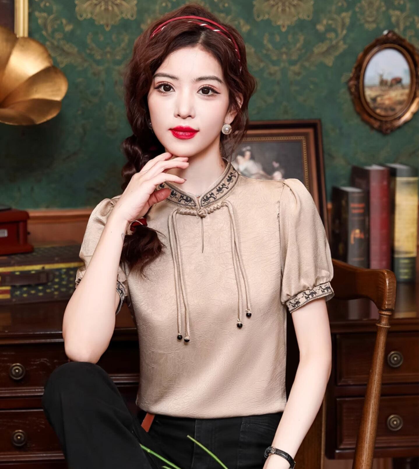 チャイナ服 トップス 春夏薄手 刺繍襟袖 半袖 エレガント 上品な風合い 普段着チャイナ zh579