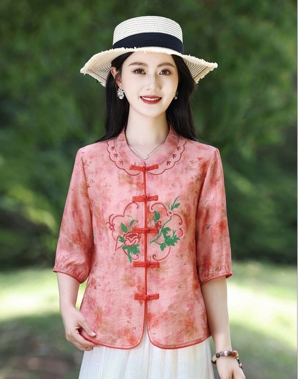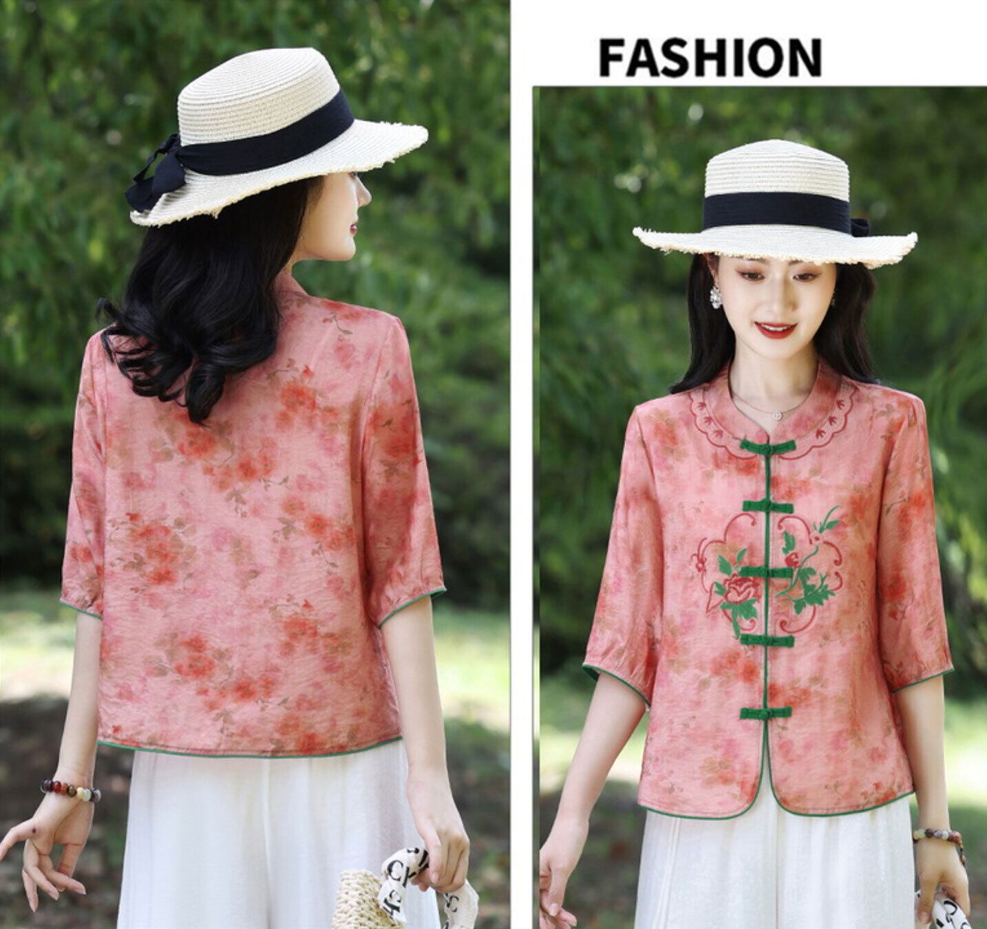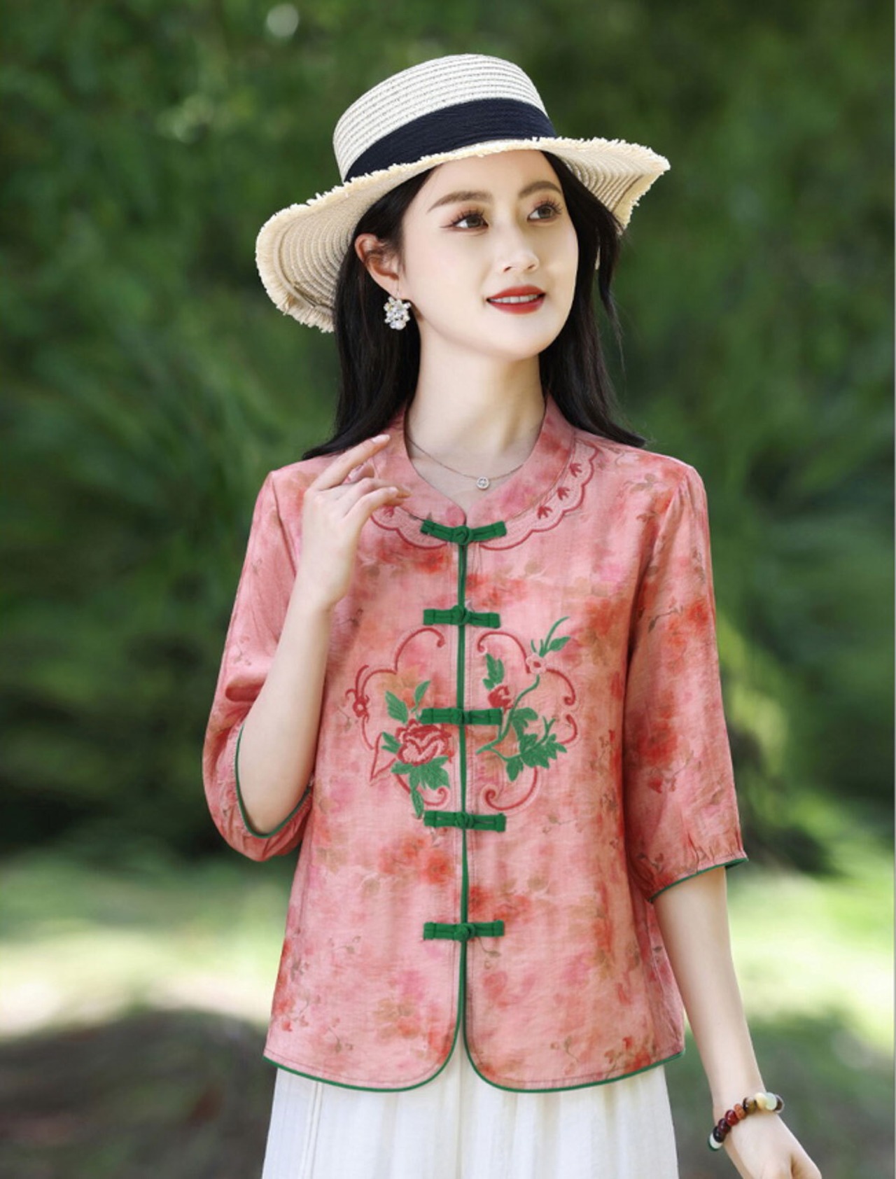 チャイナ服 トップス 夏物薄手 刺繍 素朴 上品 落ち着いた風合い zh642