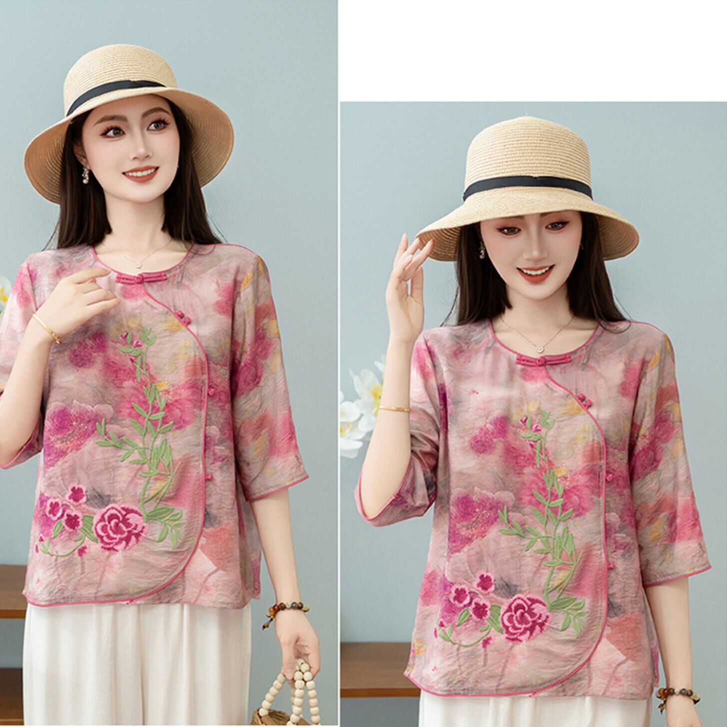 チャイナ服 トップス 夏物薄手 刺繍 素朴 上品 落ち着いた風合い zh643