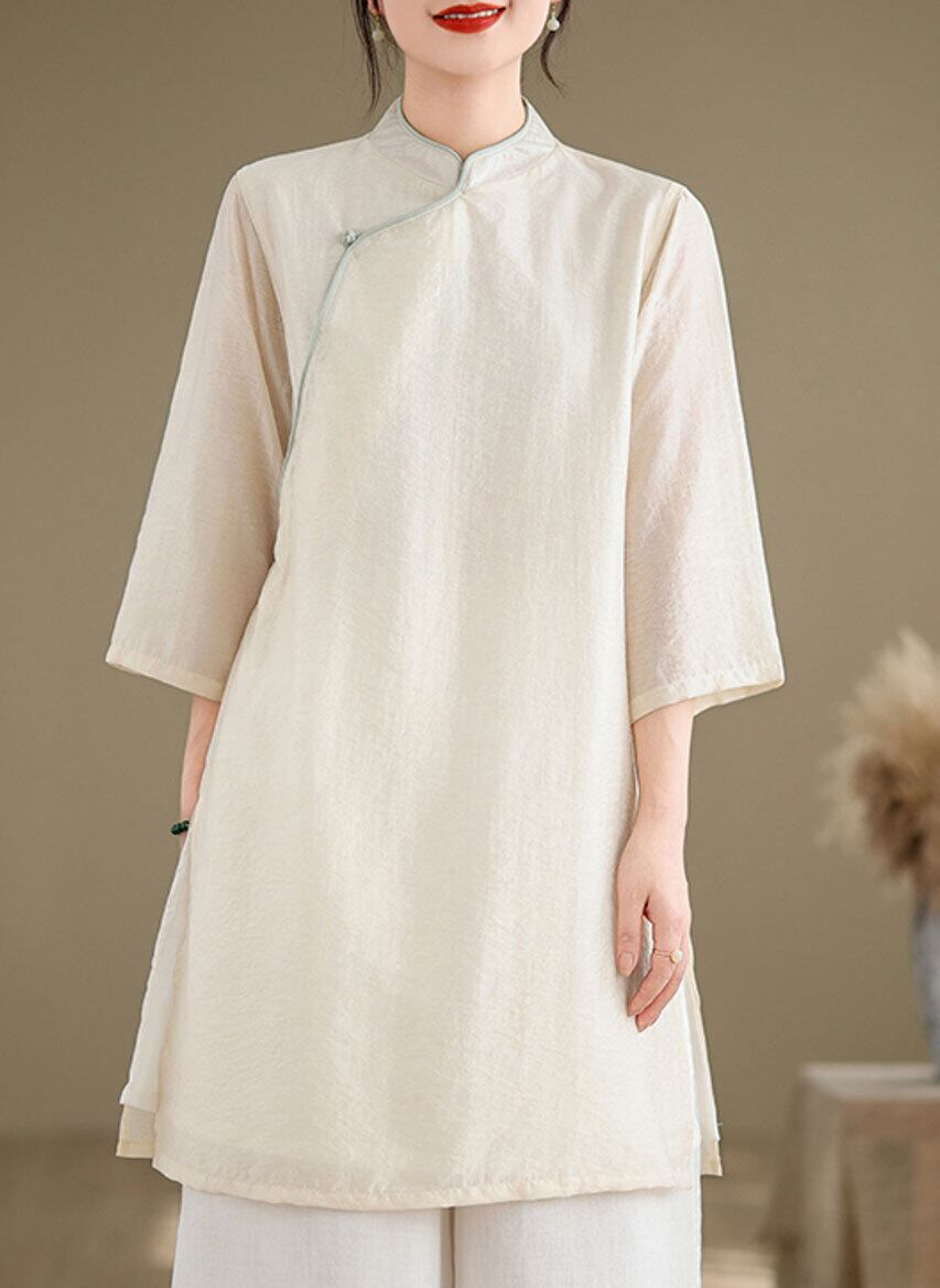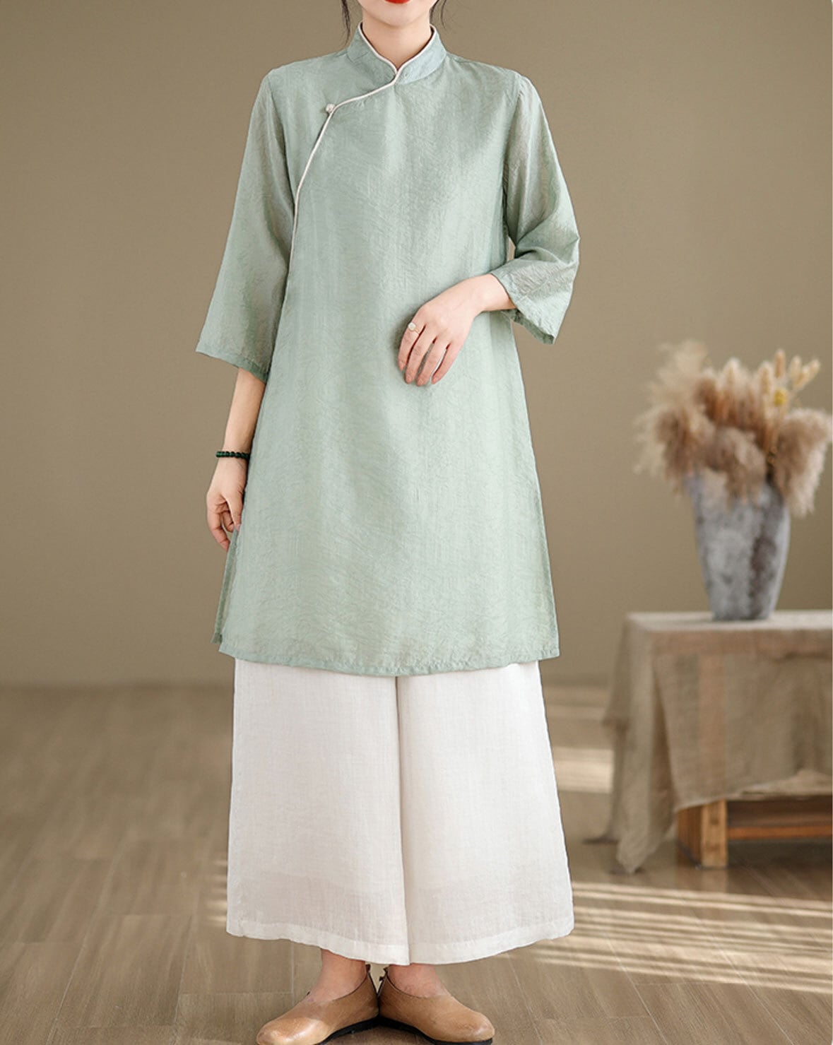 チャイナ服 トップス 夏物ロング丈 シンプル 柄なし 浅襟 落ち着いた風合い zh647