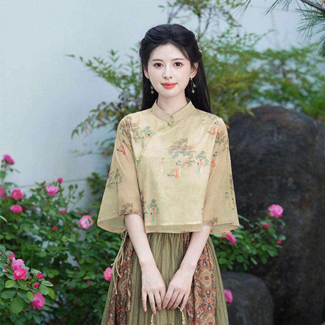 チャイナ服 トップス 夏物薄手 中国絵柄 5分袖 浅襟 素朴 落ち着いた風合い zh649