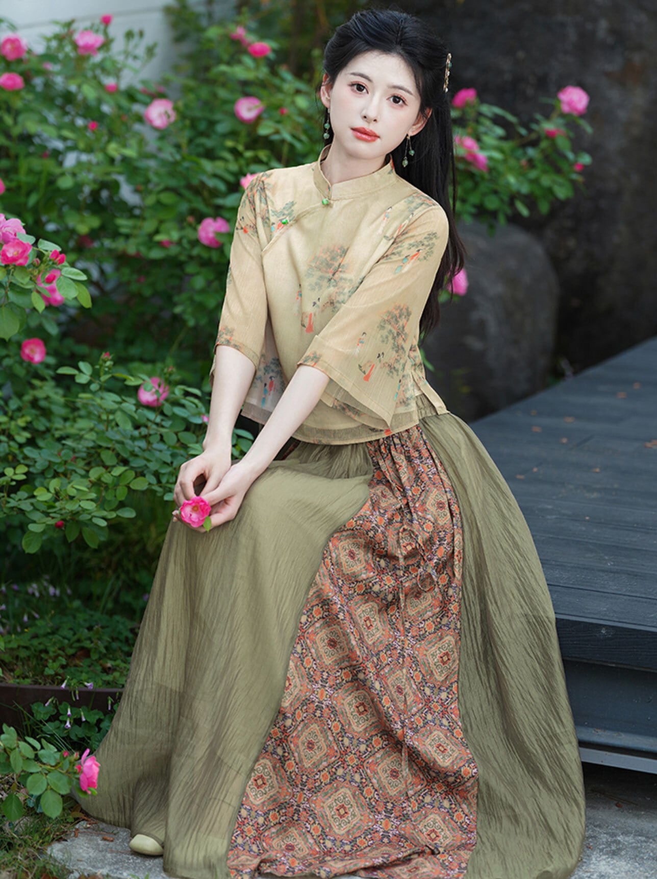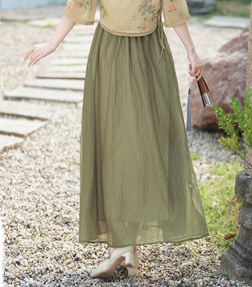 チャイナ服 スカート 夏物薄手 涼しげな風合い ロングスカート 切り替えスカート Aライン 民族衣装 zq154