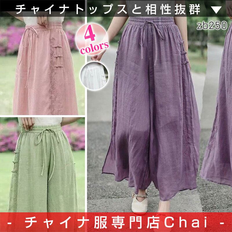 トップスも普段着も揃うチャイナ服専門店chaiです。こちらはチャイナ服 ワイドパンツ 春夏薄手 リラックスパンツ シンプル刺繍 チャイナトップスと相性がいいチャイナパンツ zb250の商品ページです。薄手の涼しげな楽ちんワイドパンツで、チャイナファッションのパンツにぴったりのアイテムです。