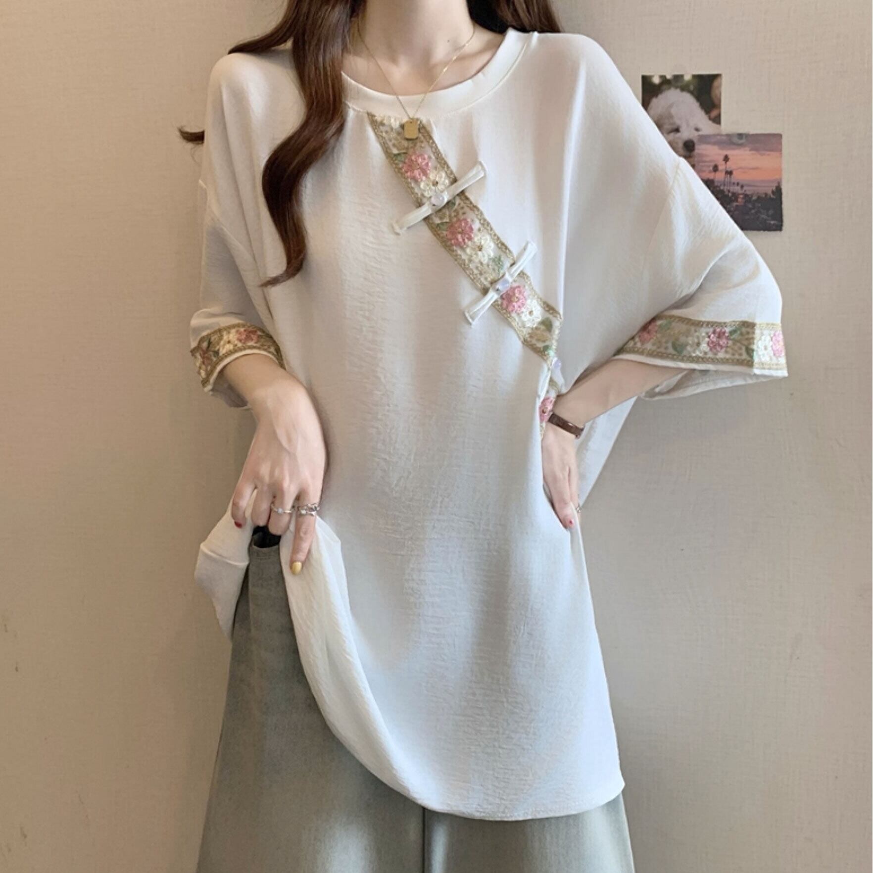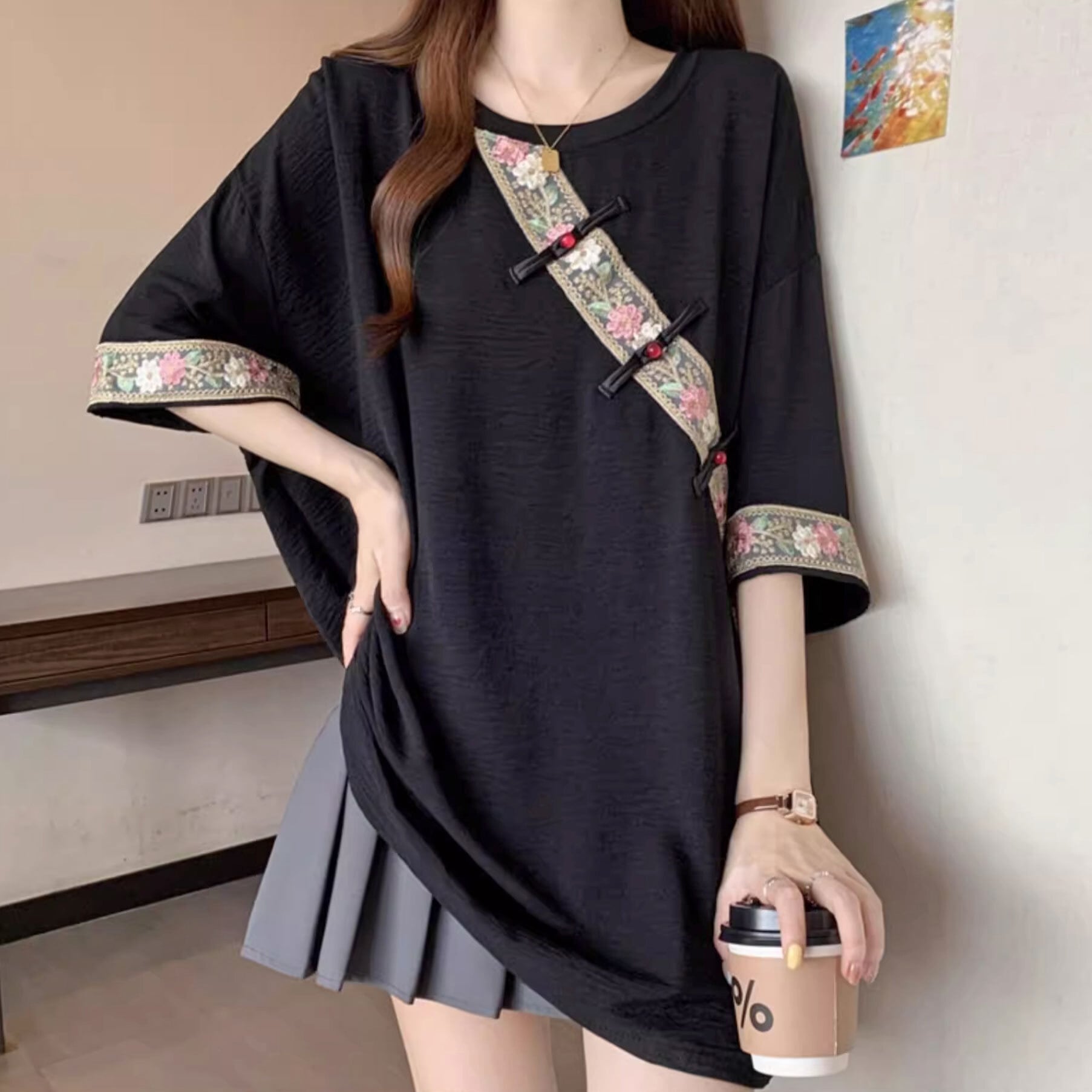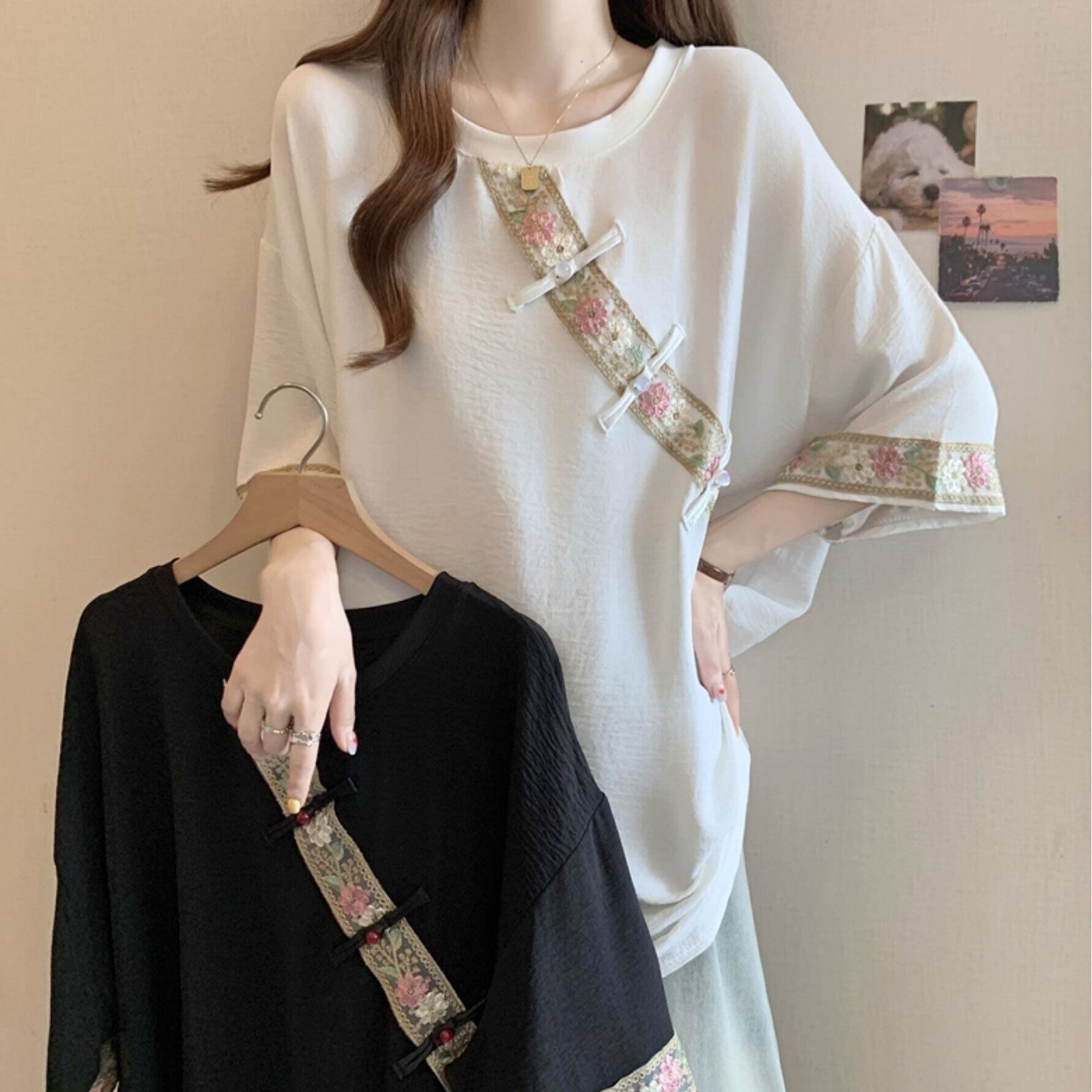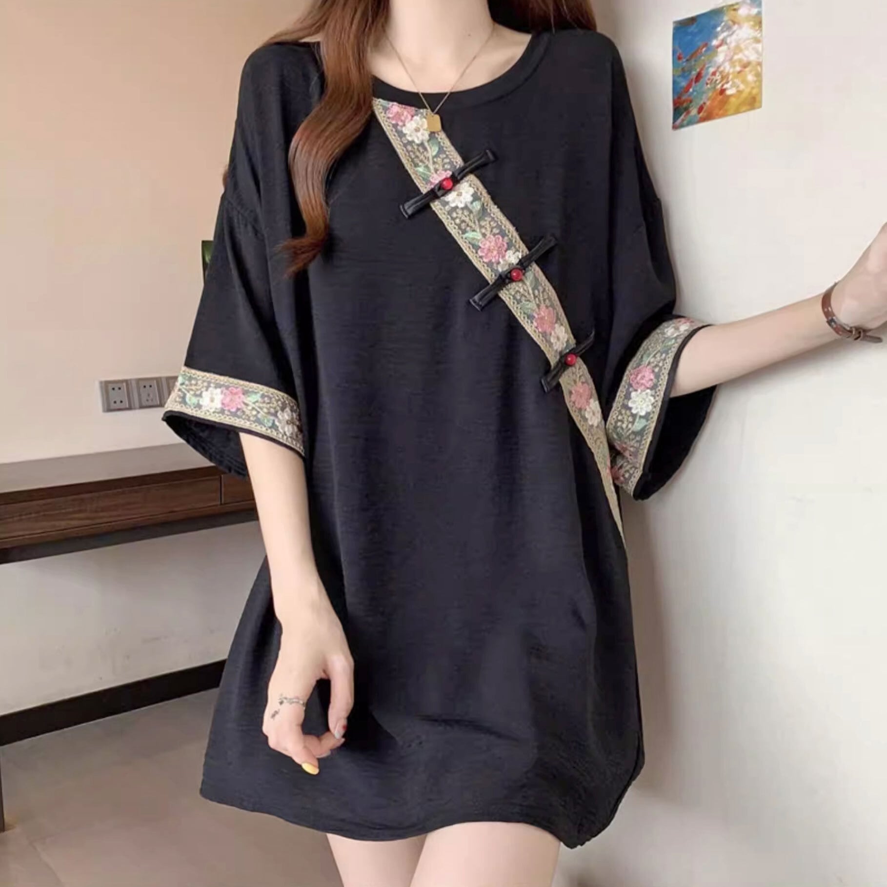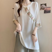 チャイナ服 トップス チャイナ風装飾オーバーサイズシャツ ゆったり可愛い Tシャツタイプ 襟なし zh653