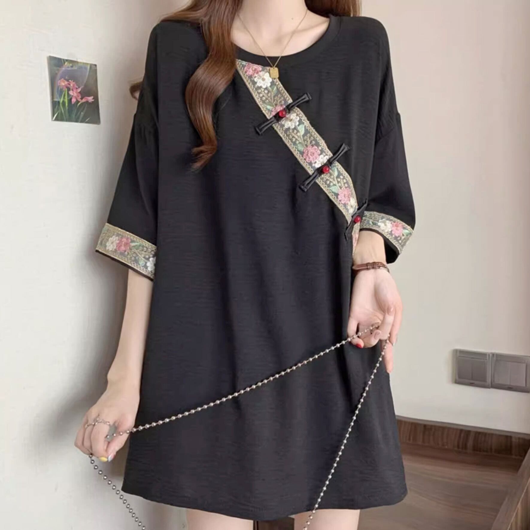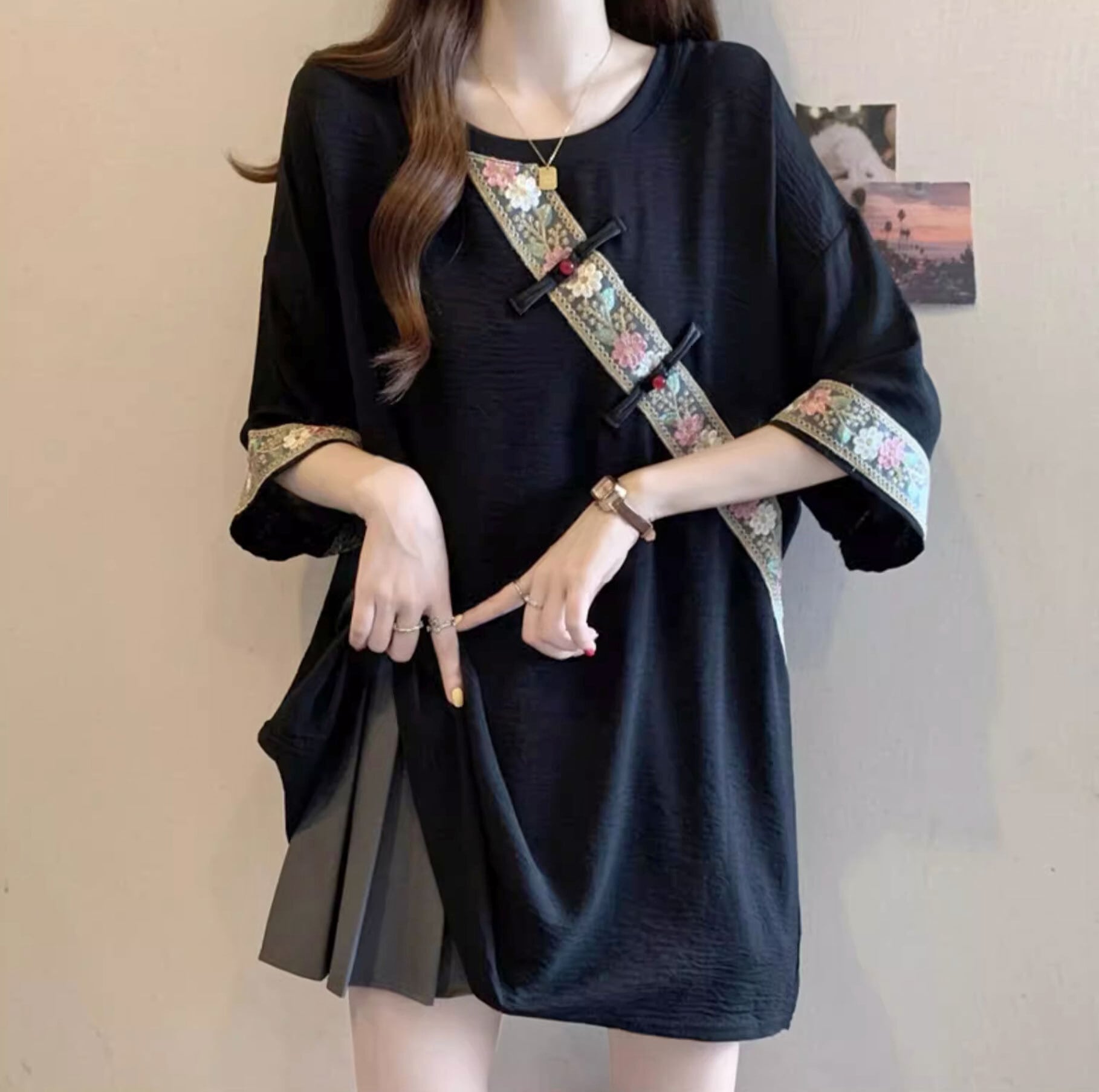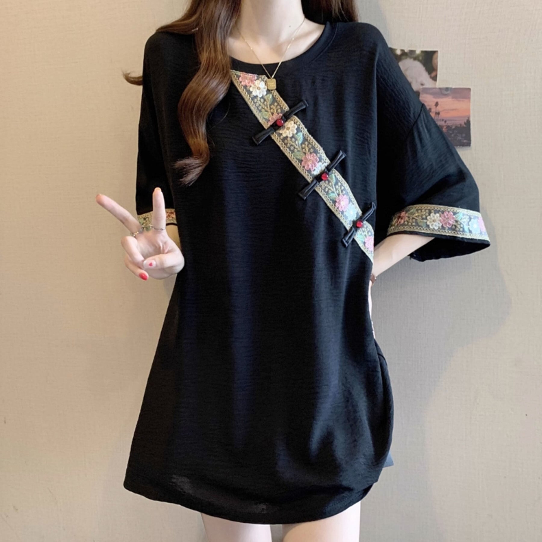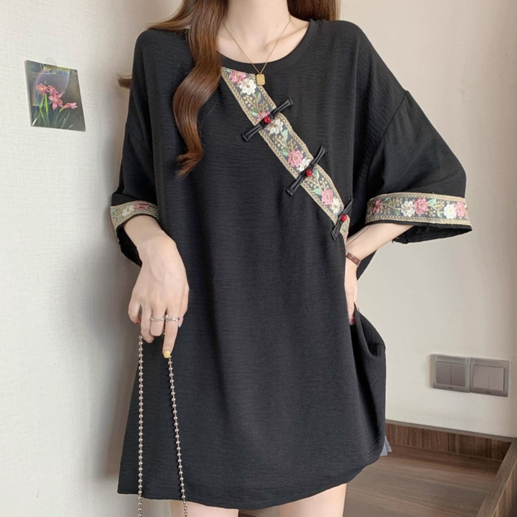 チャイナ服 トップス チャイナ風装飾オーバーサイズシャツ ゆったり可愛い Tシャツタイプ 襟なし zh653