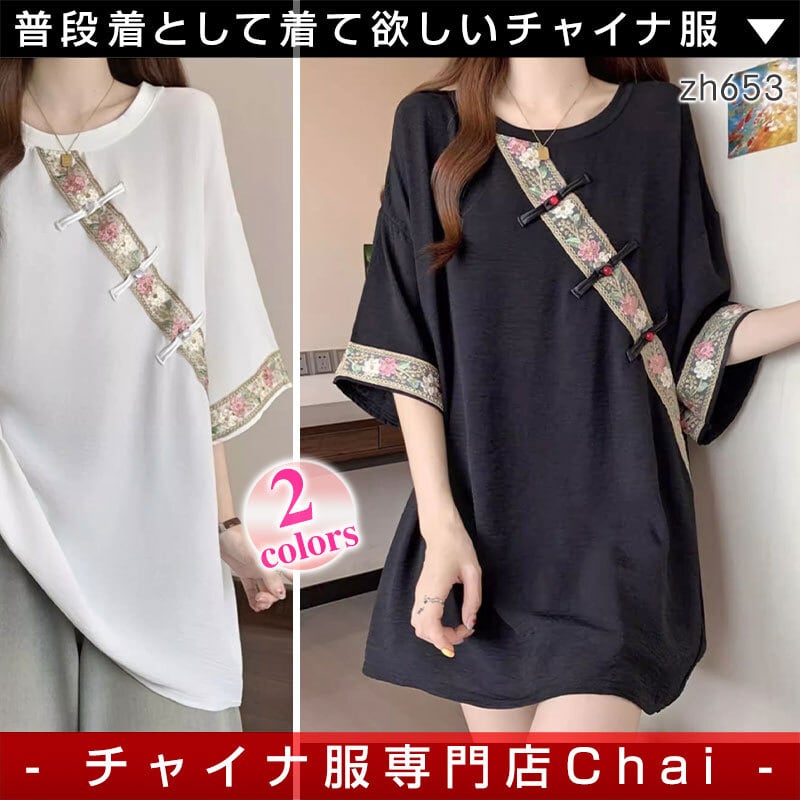 トップスも普段着も揃うチャイナ服専門店chaiです。こちらはチャイナ服 トップス チャイナ風装飾オーバーサイズシャツ ゆったり可愛い Tシャツタイプ 襟なし zh653の商品ページです。オーバーサイズの可愛いャイナトップスで、春夏秋の普段着チャイナファッションでつかいやすいアイテムです。