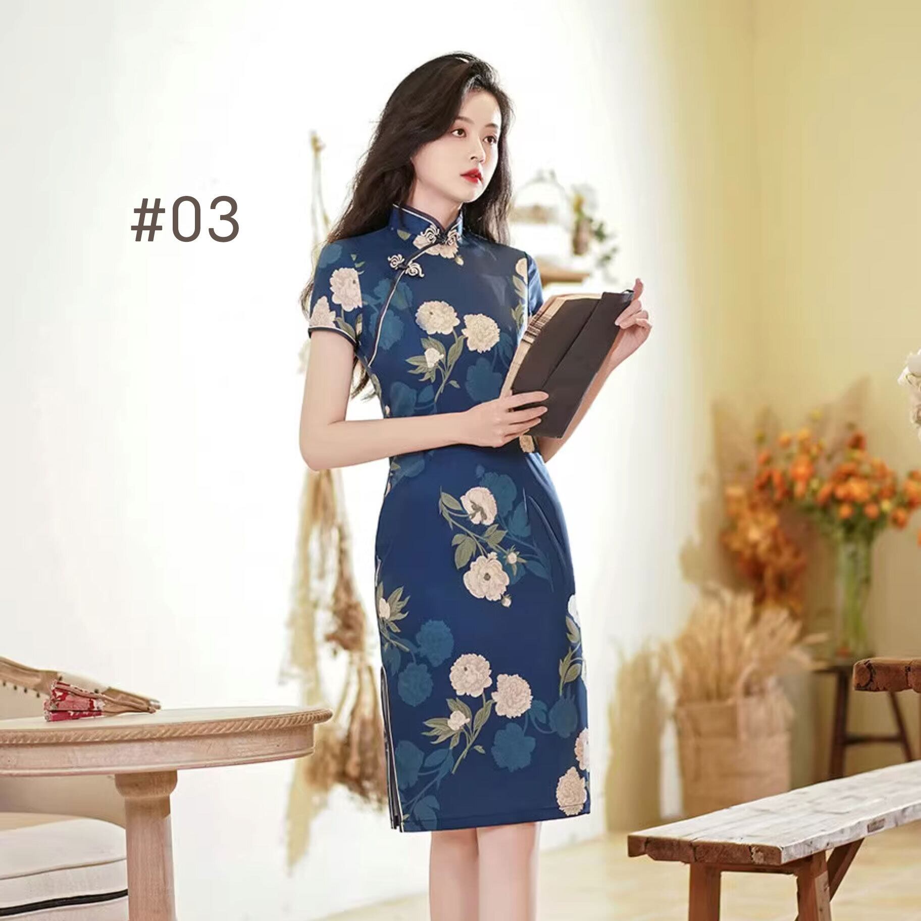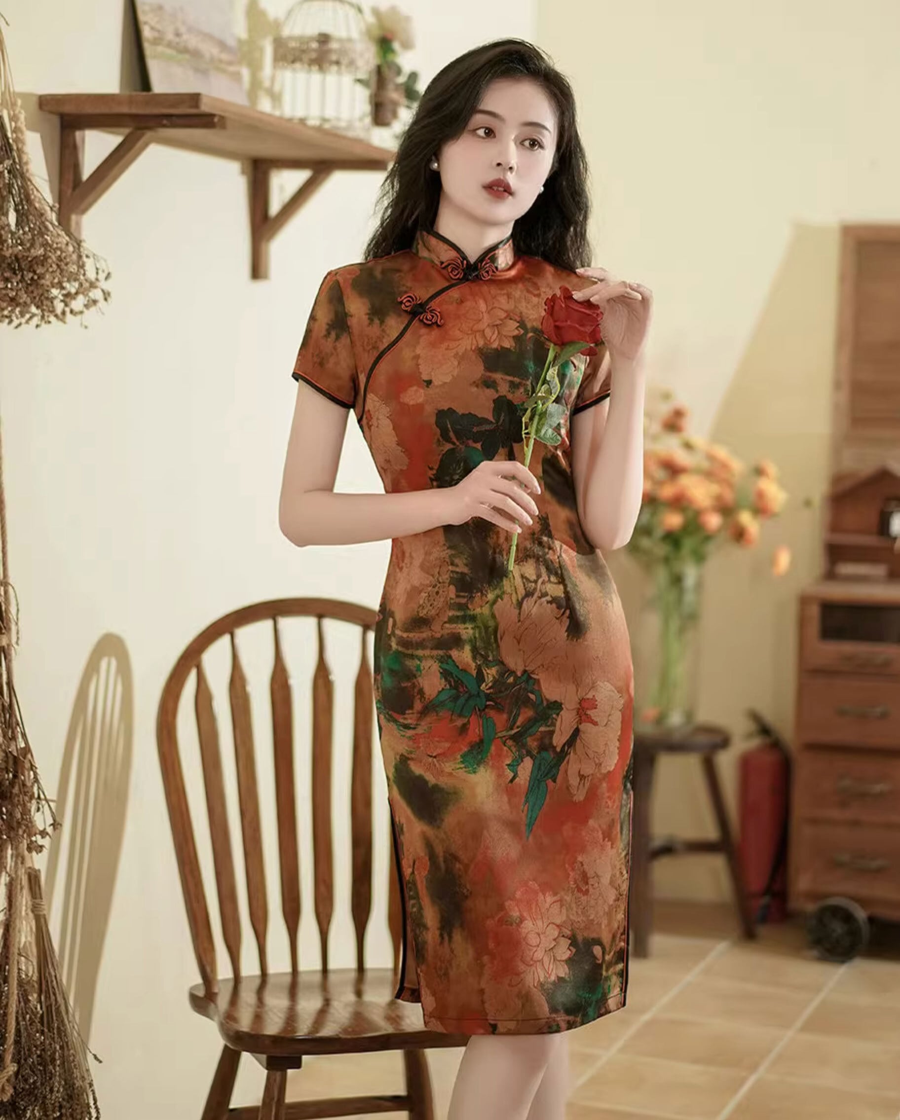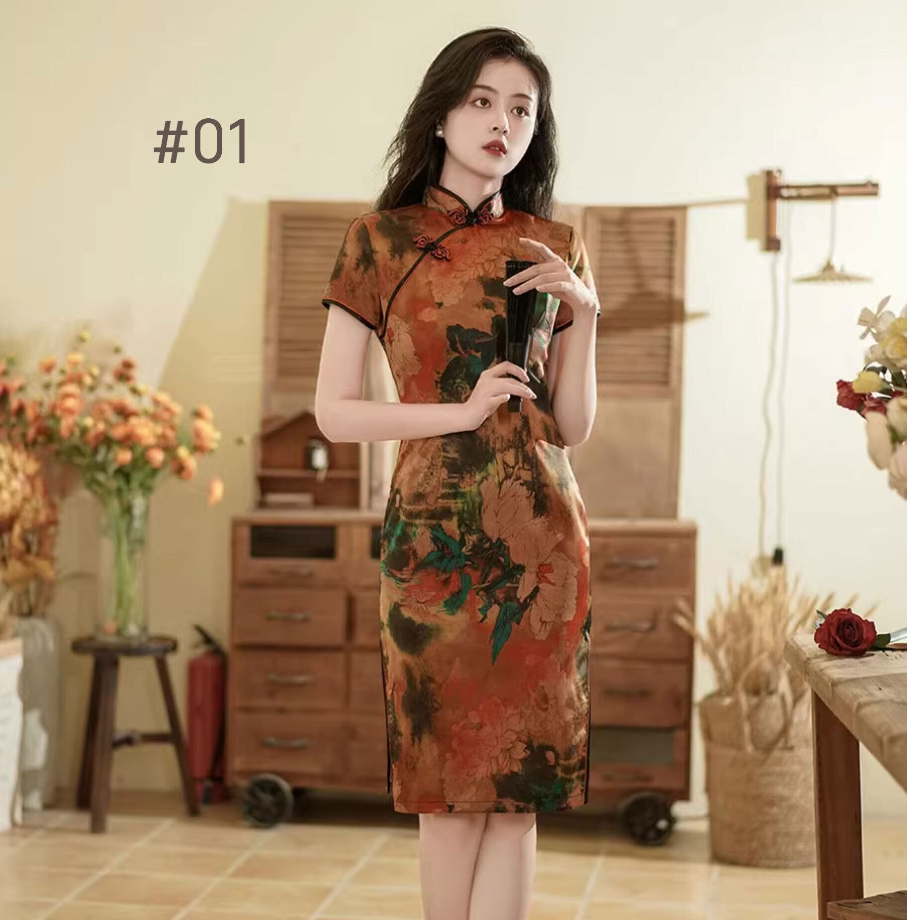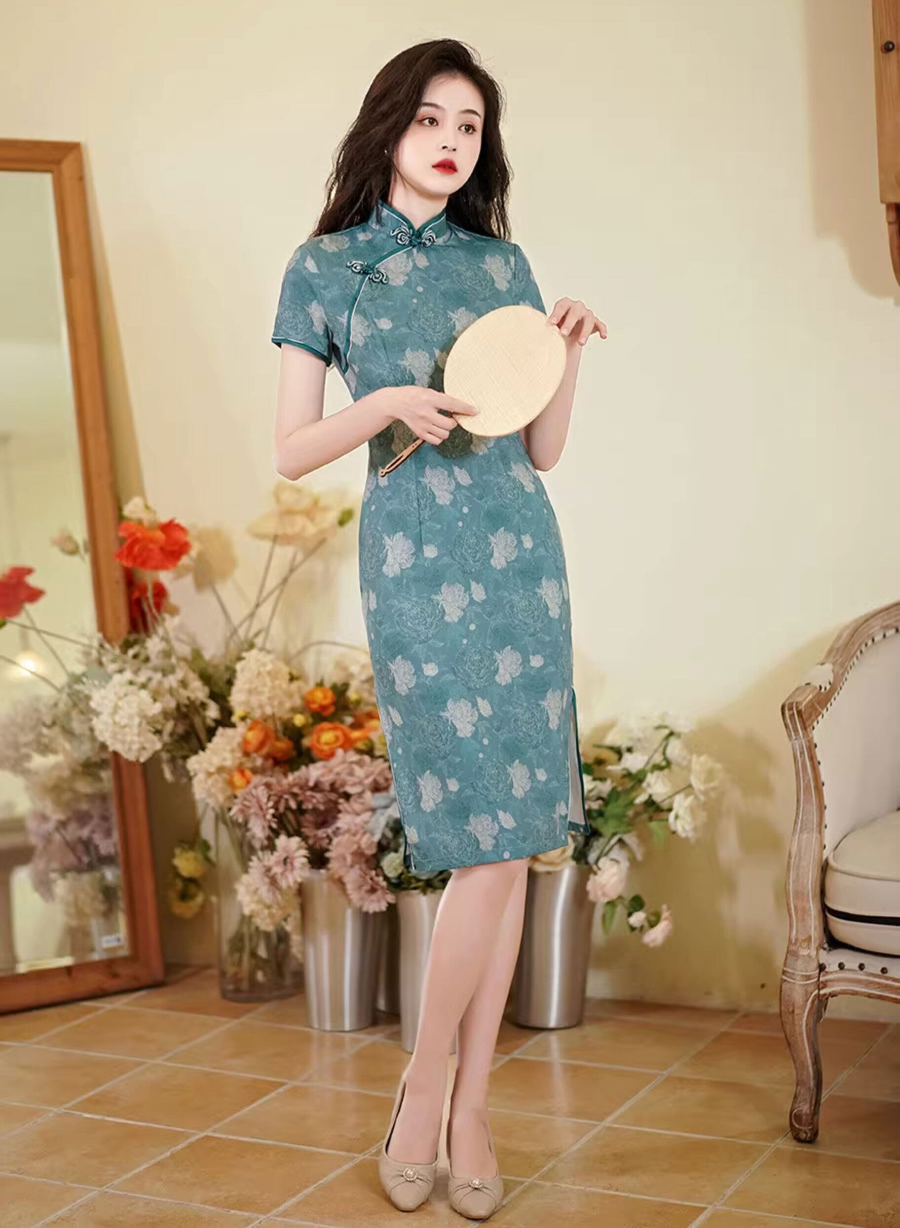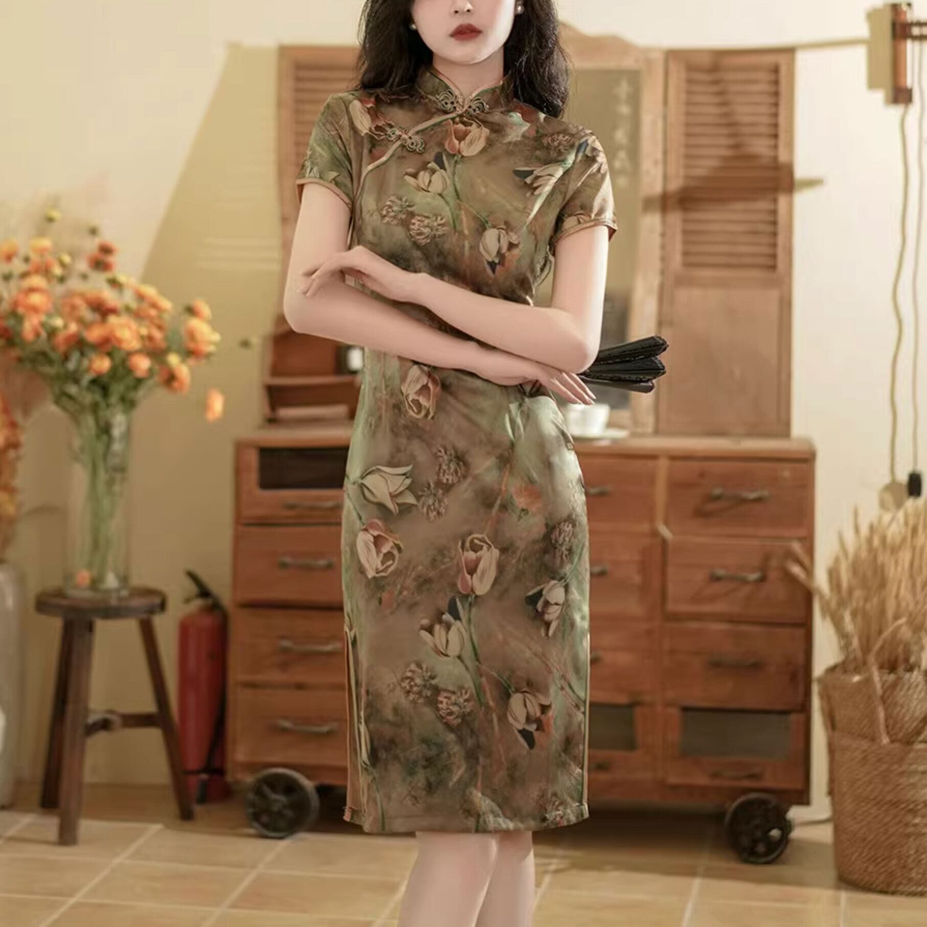 チャイナドレス ワンピース 旗袍 チーパオ ミドル丈 ひざ丈 素朴 落ち着いた風合い 半袖 チャイナ風ワンピ アオザイ zs290