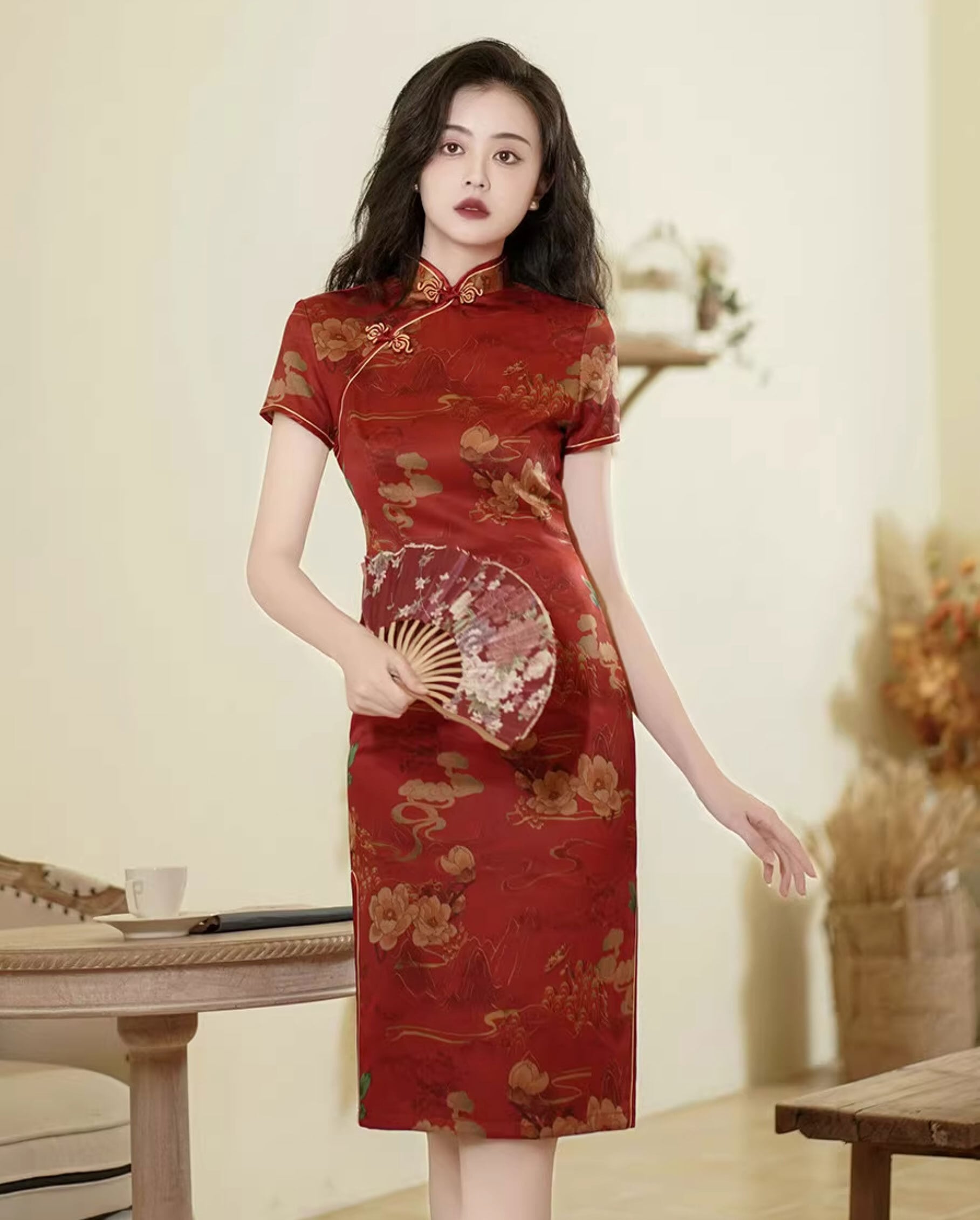 チャイナドレス ワンピース 旗袍 チーパオ ミドル丈 ひざ丈 素朴 落ち着いた風合い 半袖 チャイナ風ワンピ アオザイ zs291