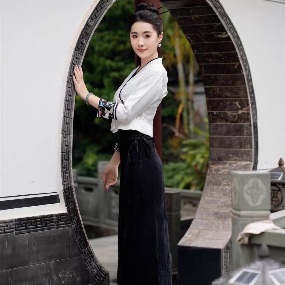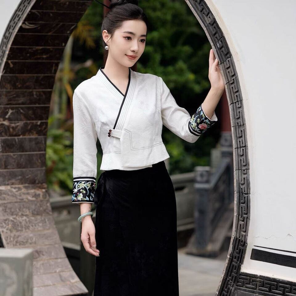 チャイナ服 トップス 七分袖 白 落ち着いた風合い 袖装飾 斜め合わせ 二胡衣装 普段着チャイナ zt638