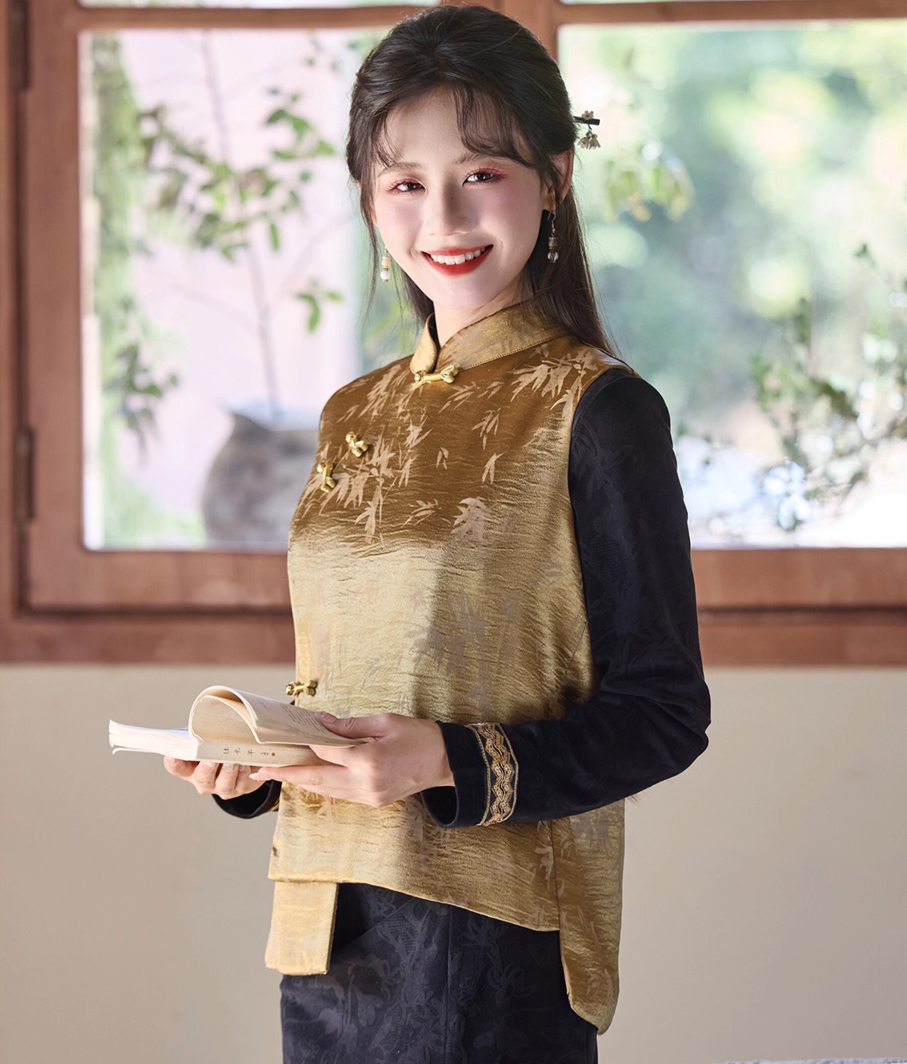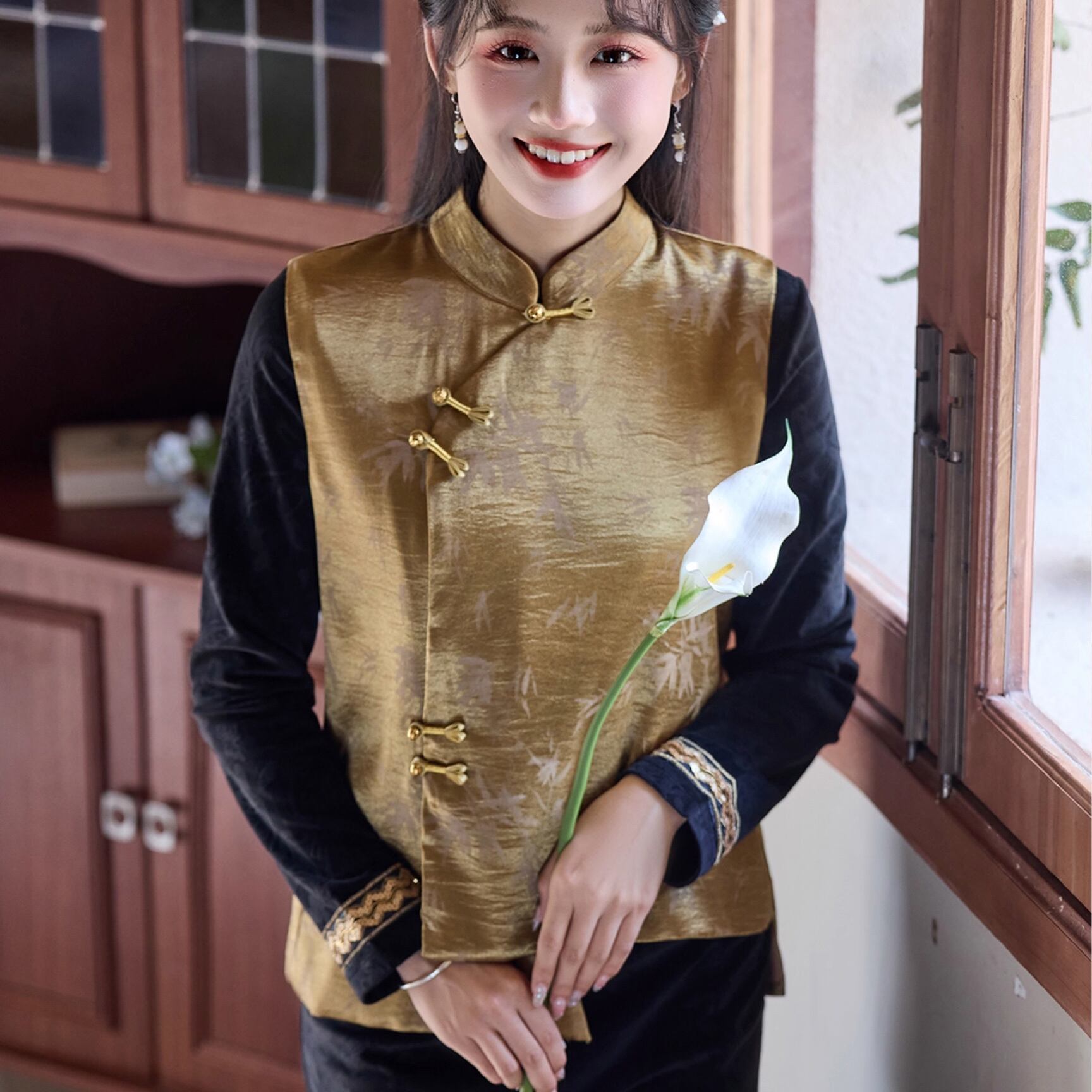 チャイナ服 ベスト 上品 ツヤあり エレガント 高級感 ゴールド チャイナジレ 重ね着にちょうどいい zv99