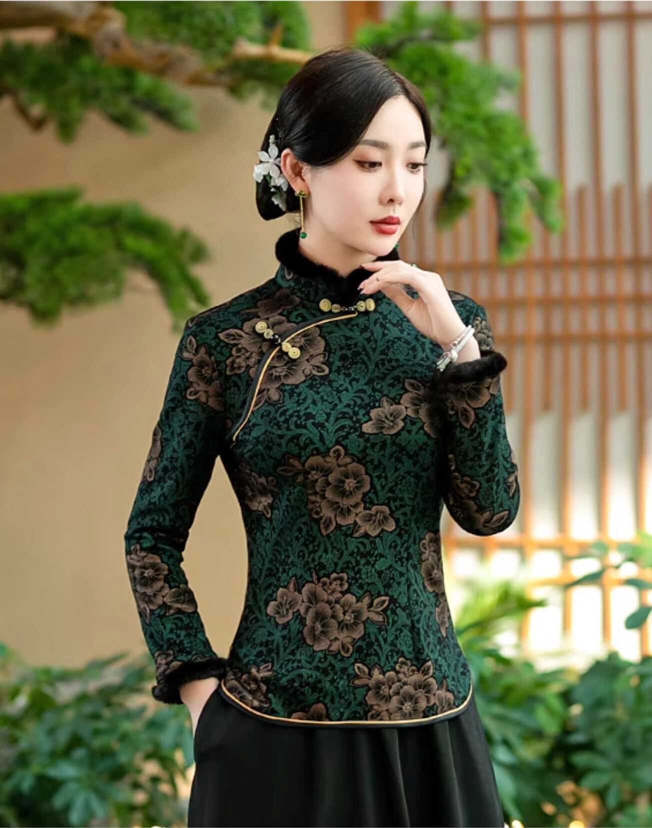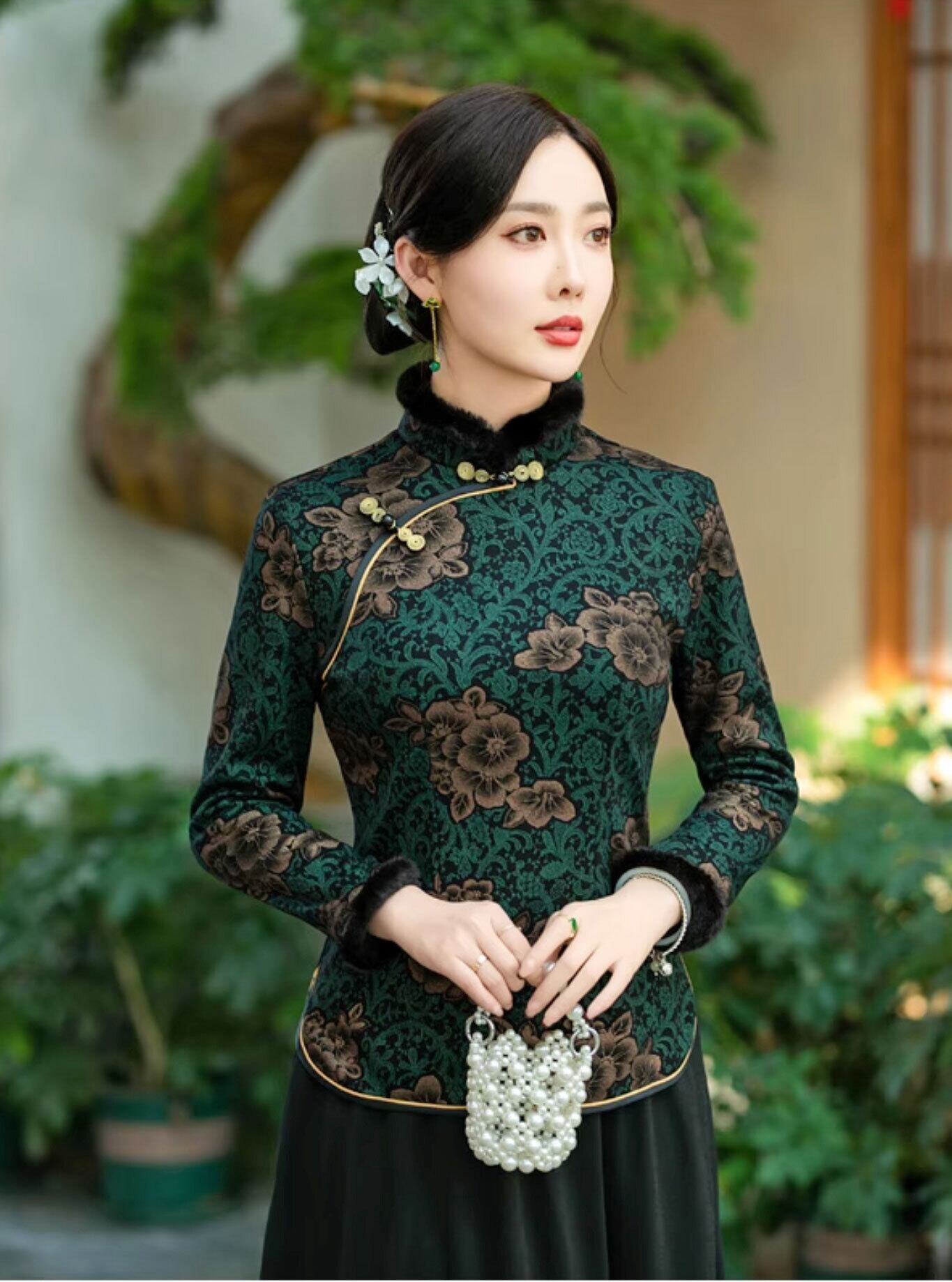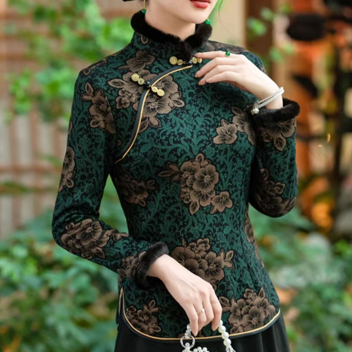チャイナ服 トップス 長袖 ファー付き 花柄 エレガント 上品な風合い 二胡衣装 普段着チャイナ zt644