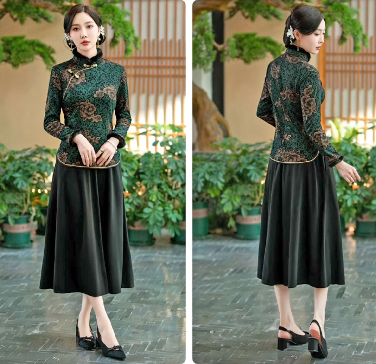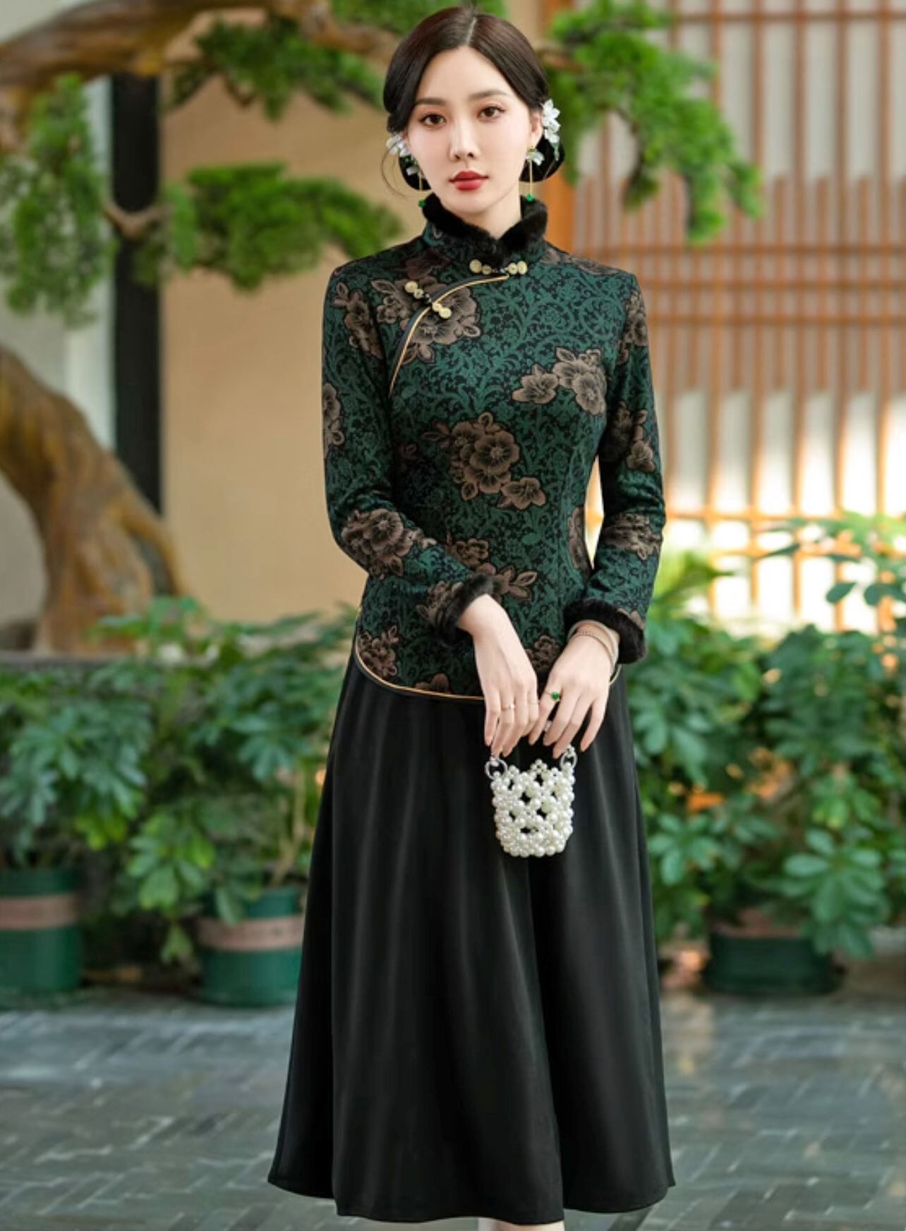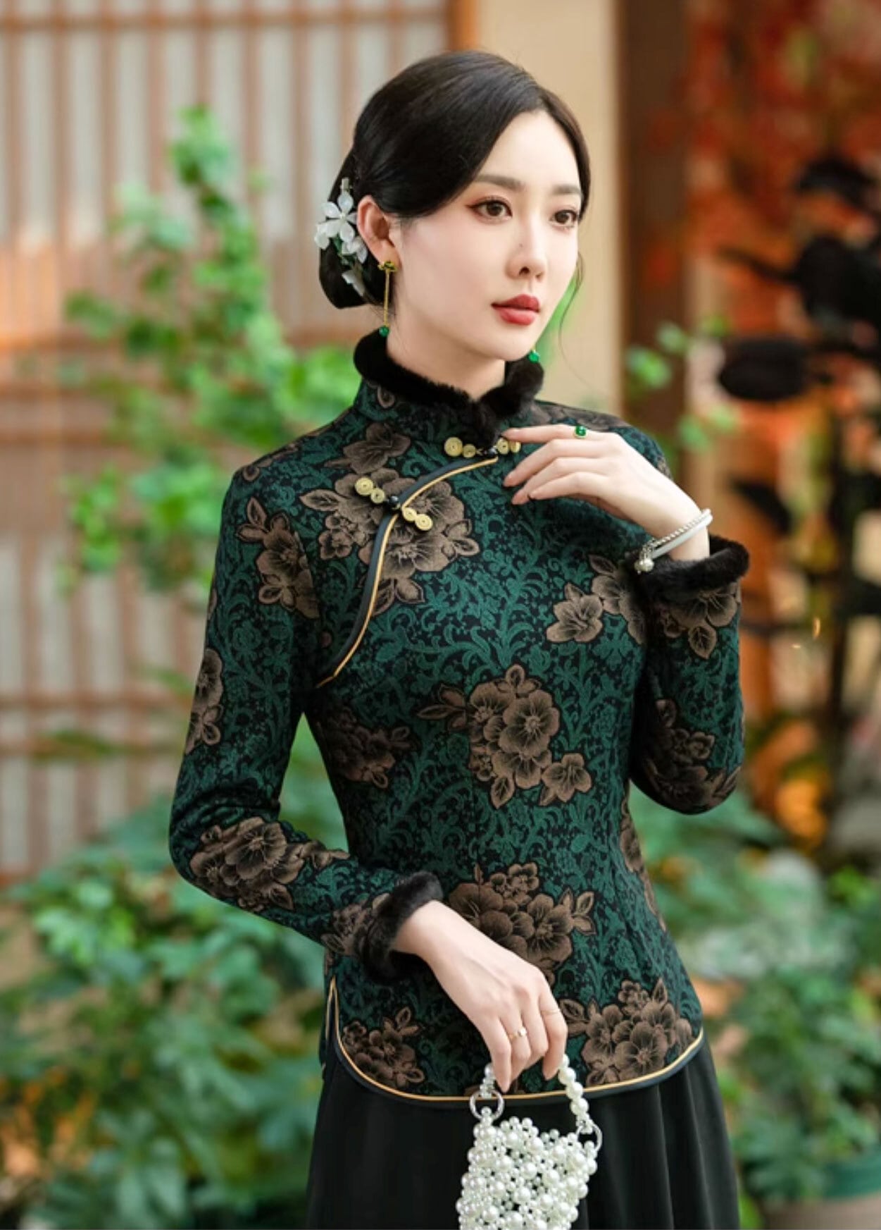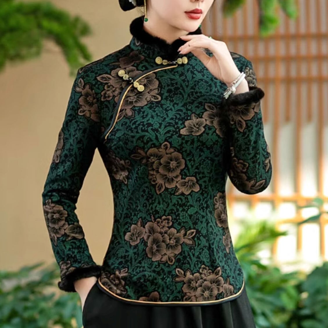 チャイナ服 トップス 長袖 ファー付き 花柄 エレガント 上品な風合い 二胡衣装 普段着チャイナ zt644