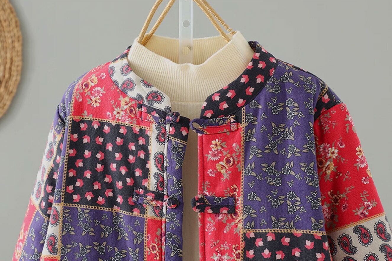 トップスも普段着も揃うチャイナ服専門店chaiです。こちらはチャイナ服 アウター 秋冬厚手トップス 羽織 パッチワーク風柄 長袖 zo240の商品ページです。素朴な雰囲気の厚手チャイナトップスで、秋冬のチャイナファッションにちょうどよいアイテムです。