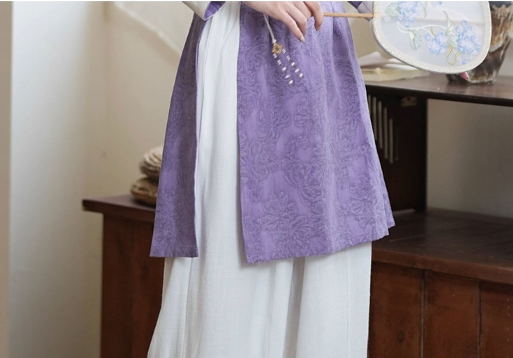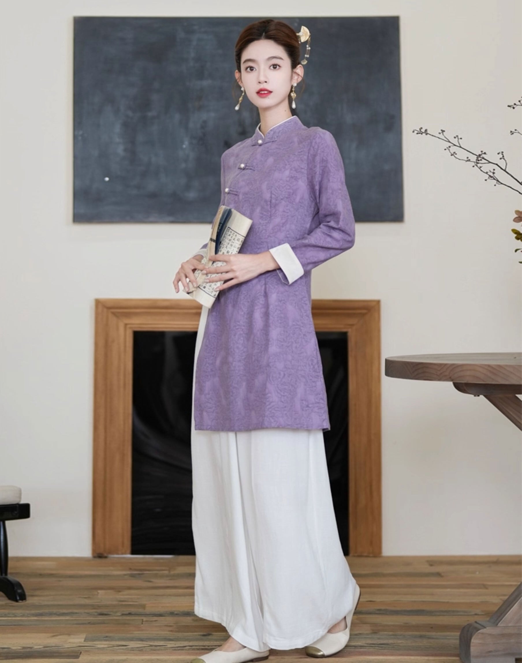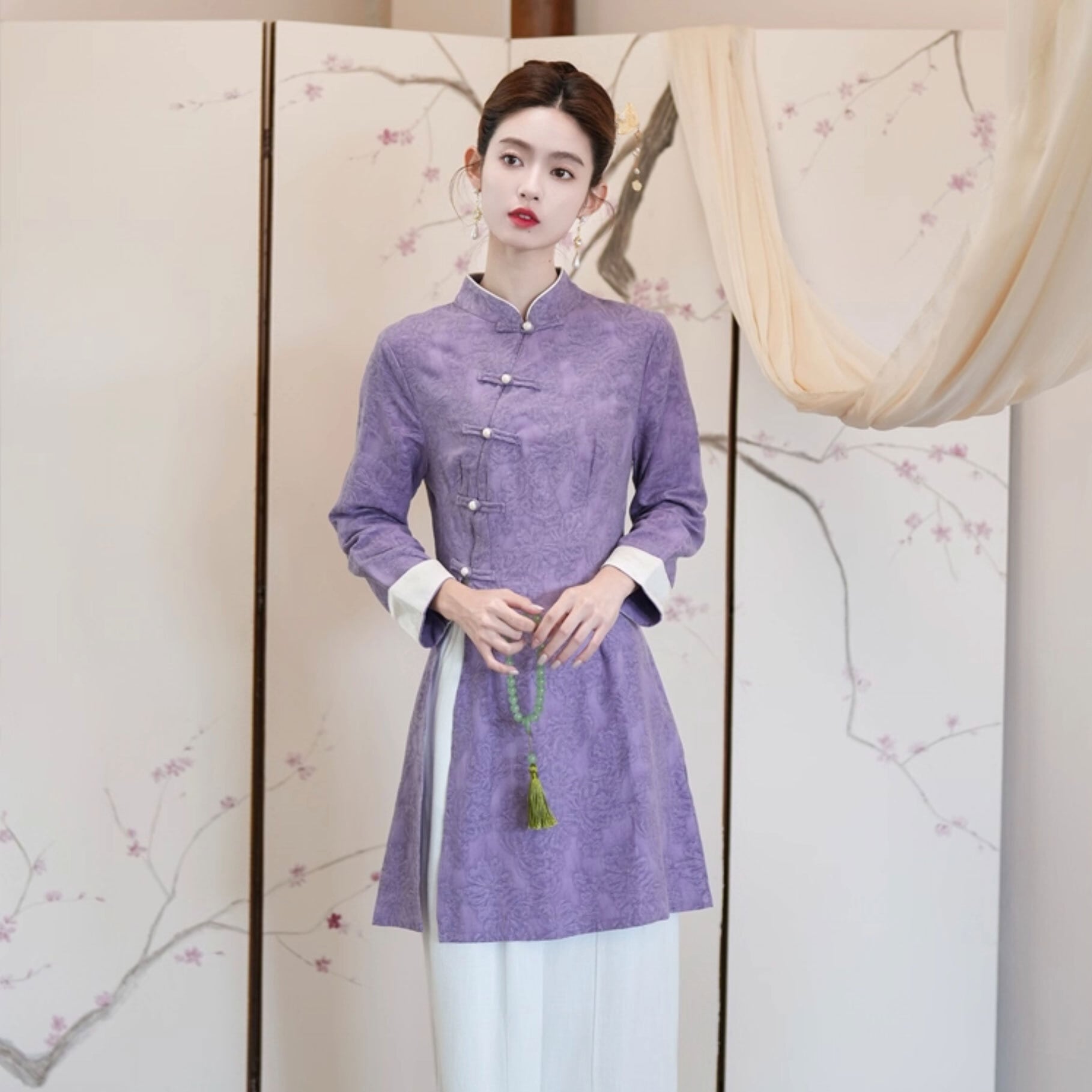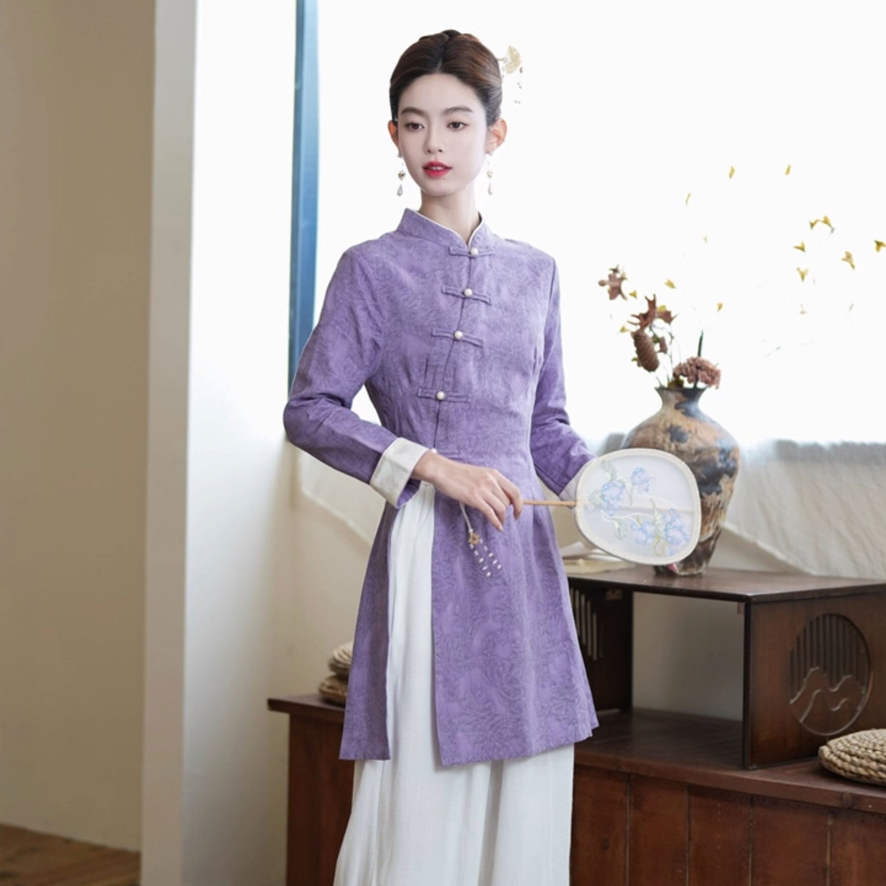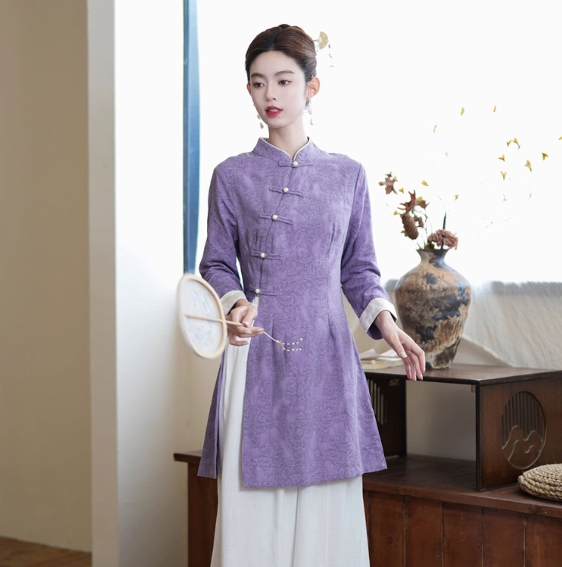 チャイナ服 トップス 秋冬 ロング丈 長袖 浅襟 パープル 上品な風合い 普段着チャイナ zt651