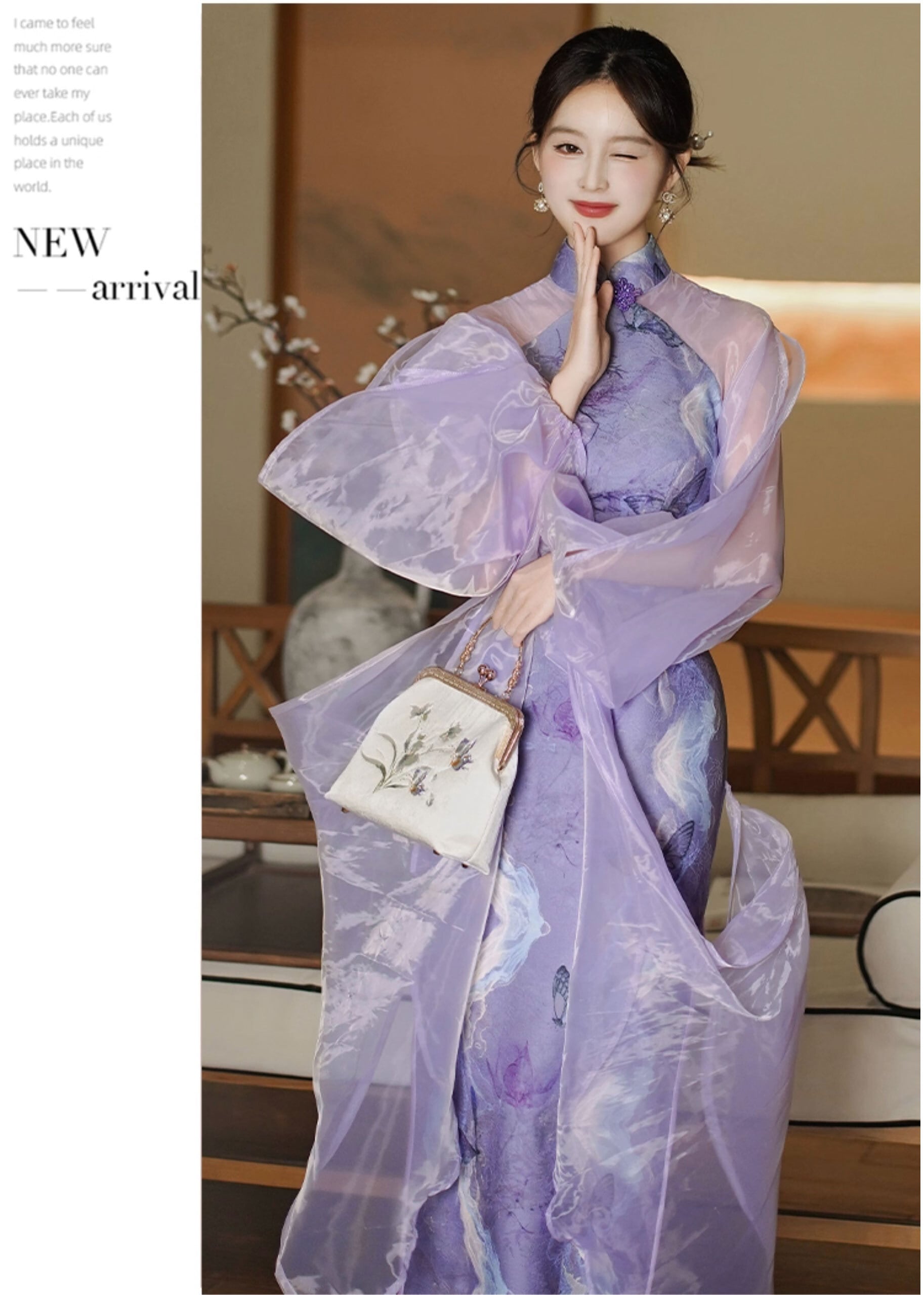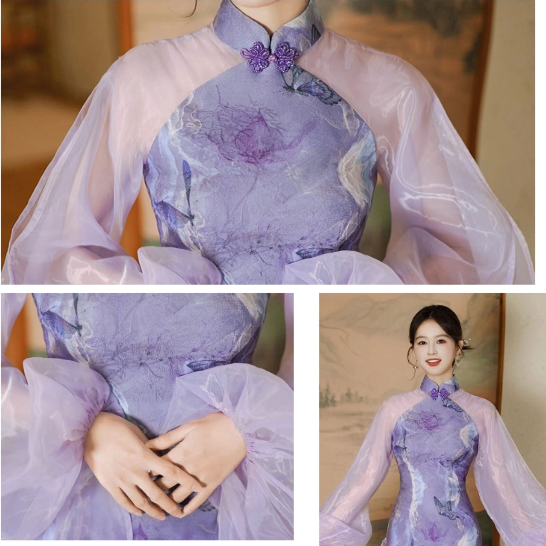 チャイナドレス ワンピース 透け感袖 エレガント 旗袍 チーパオ マキシ丈 チャイナ風ワンピ アオザイ 舞台衣装 zl486