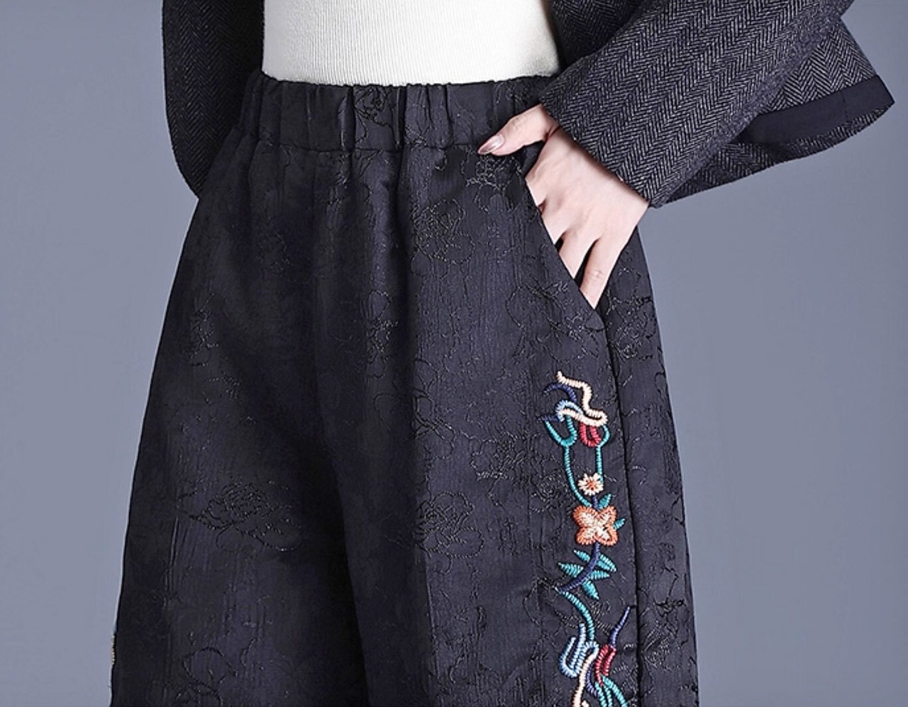 チャイナ服 ストレートパンツ 秋冬厚め サイド刺繍 チャイナパンツ ウエストゴム 上品な風合い チャイナトップスと相性がいいチャイナパンツ zb274