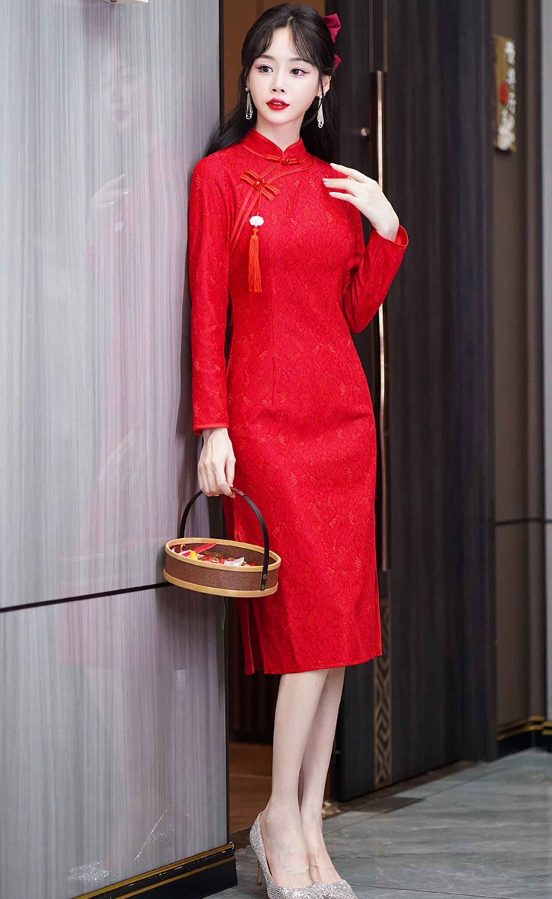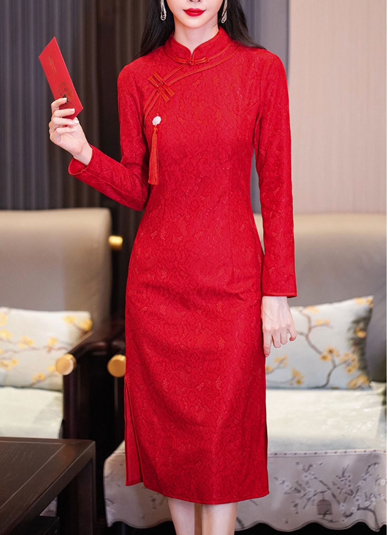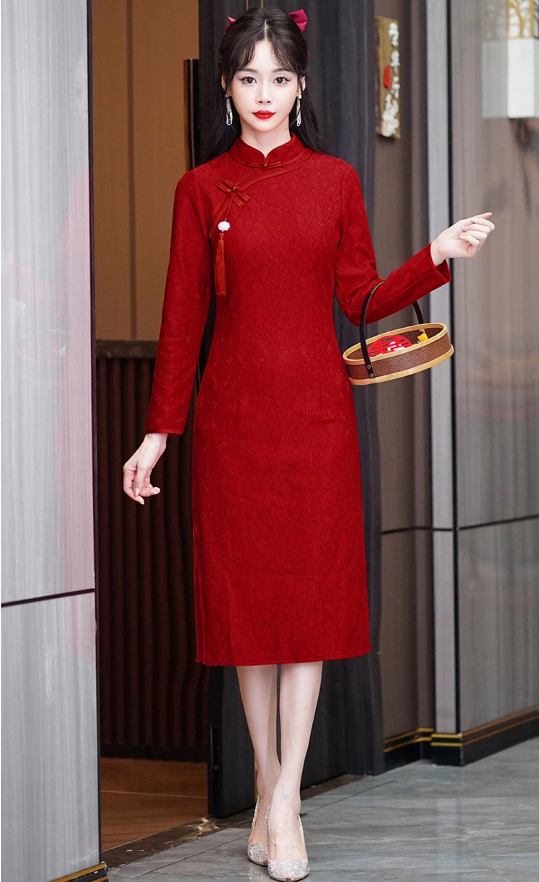 チャイナドレス ワンピース 秋冬旗袍 レッド チーパオ ミドル丈 長袖 落ち着いた風合い チャイナ風ワンピ アオザイ zs293