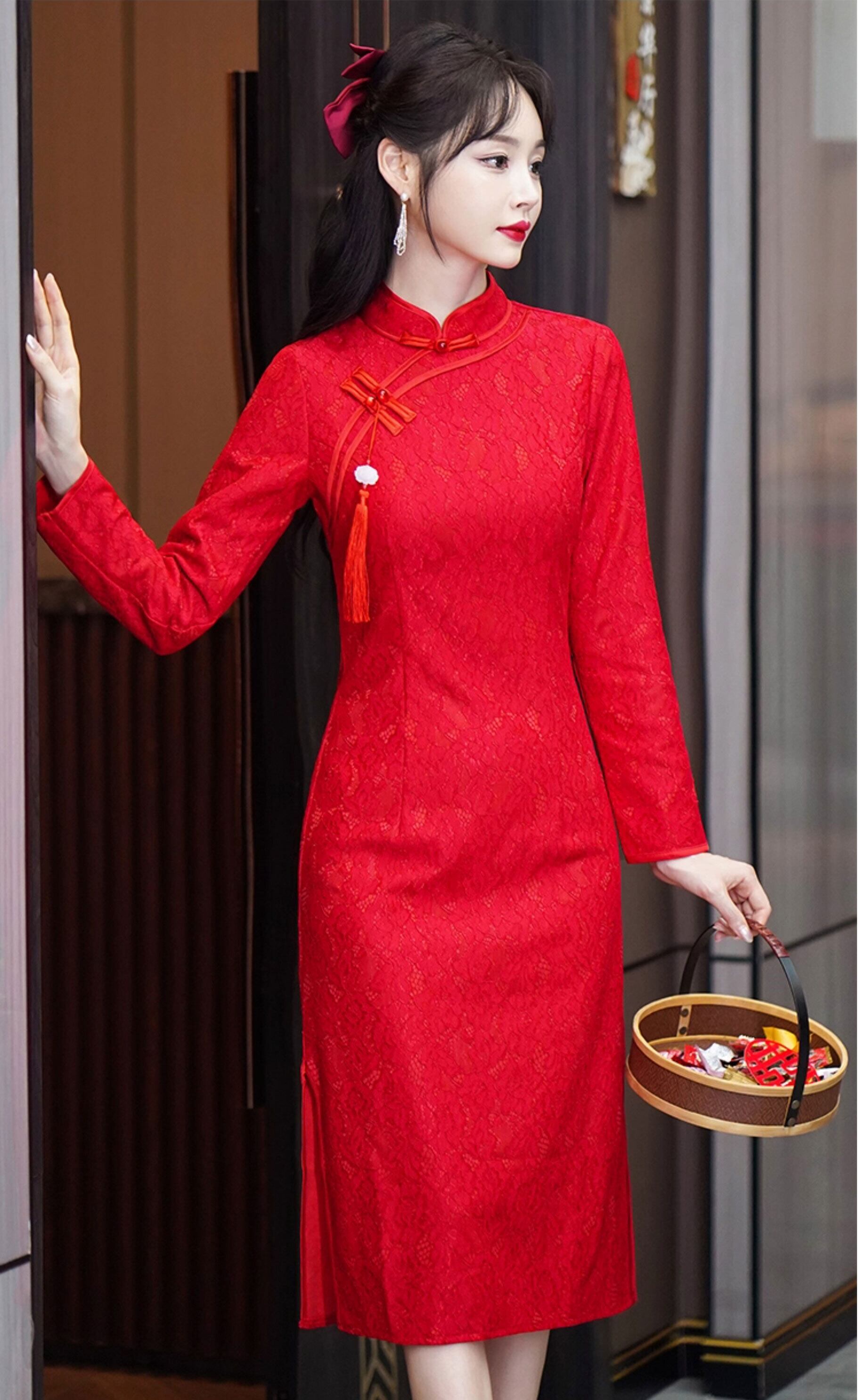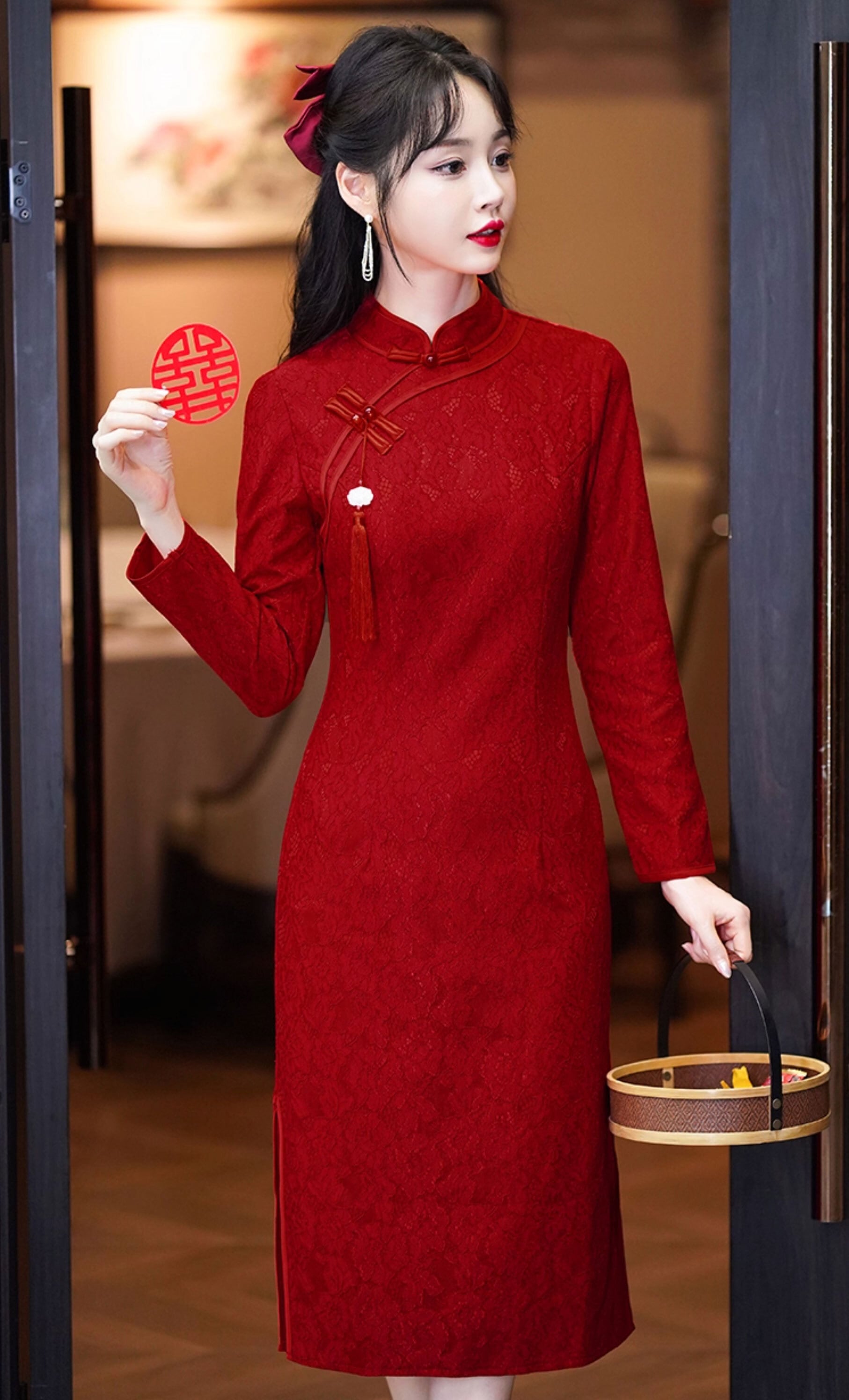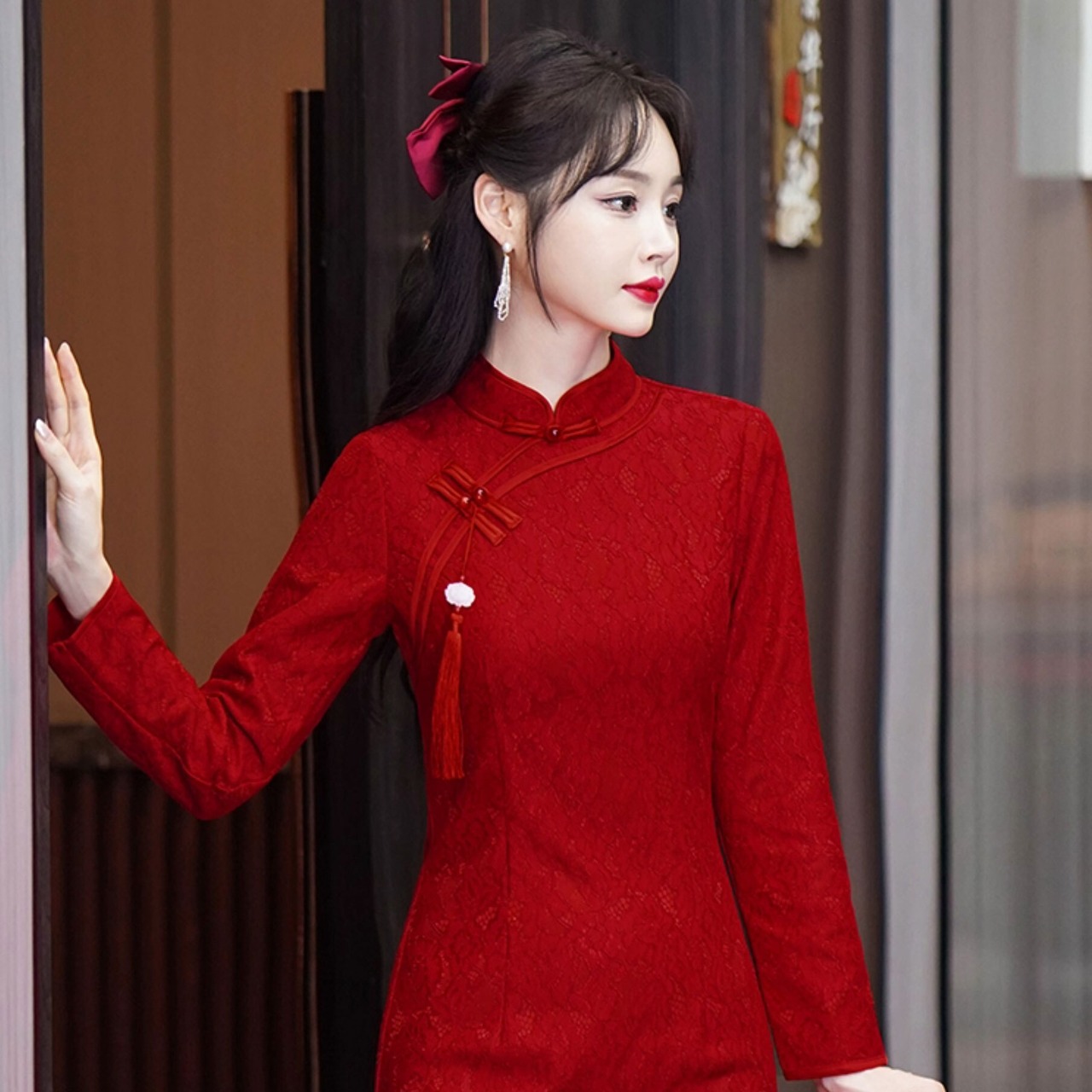 チャイナドレス ワンピース 秋冬旗袍 レッド チーパオ ミドル丈 長袖 落ち着いた風合い チャイナ風ワンピ アオザイ zs293