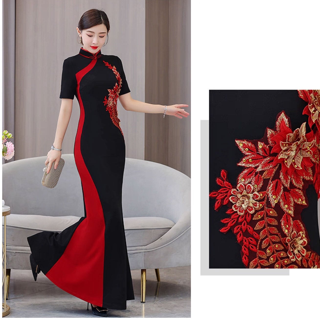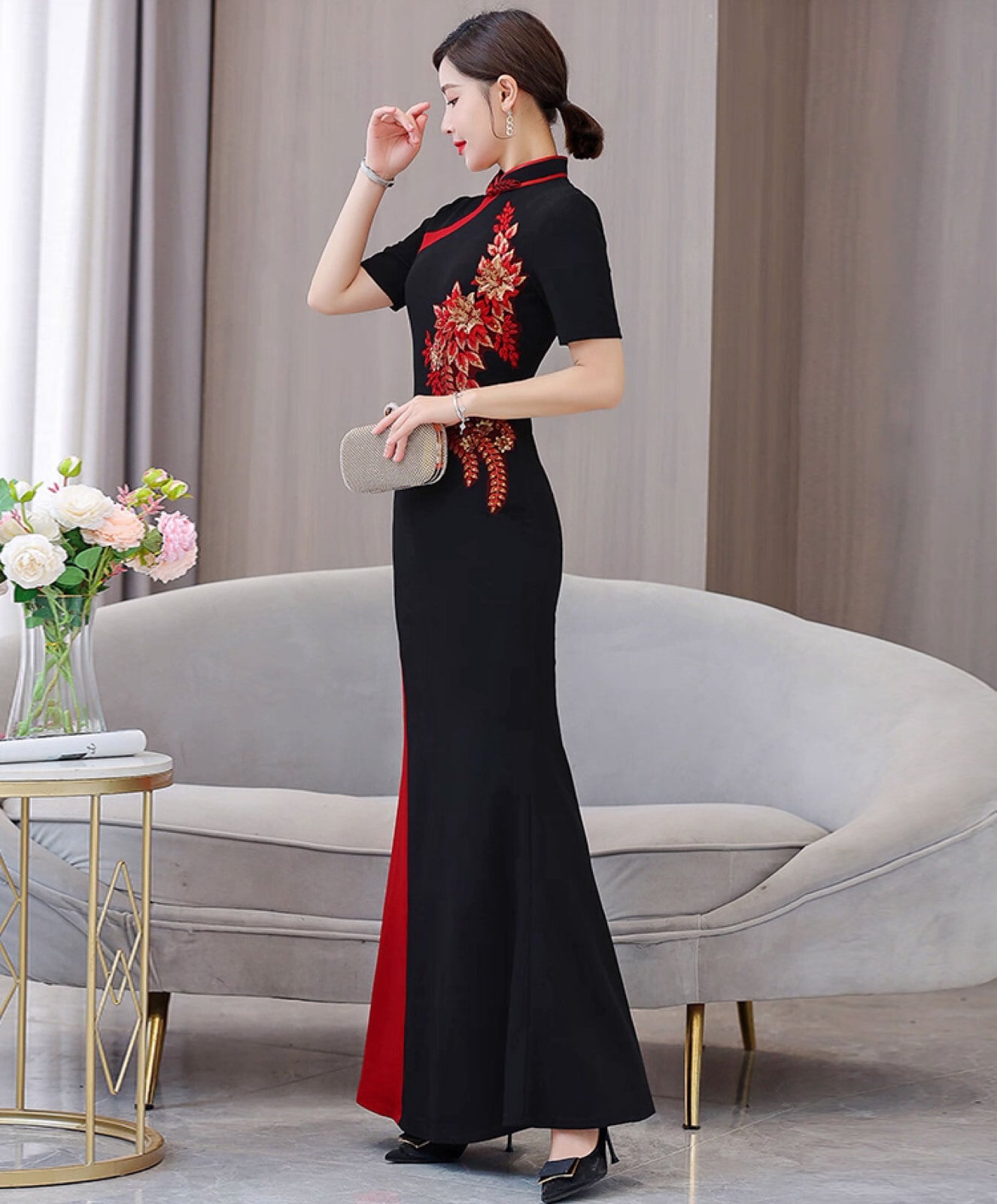チャイナドレス ワンピース 半袖 バイカラー エレガント 旗袍 チーパオ マキシ丈 zl487