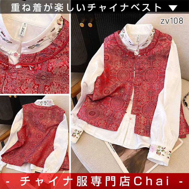 トップスも普段着も揃うチャイナ服専門店chaiです。こちらはチャイナ服 ベスト エレガント 刺繍 レッド 上品で華やかな風合い ノースリーブ 重ね着にちょうどいいジレ 普段着チャイナ zv108の商品ページです。華やかな風合いのチャイナベストで、チャイナファッションにちょうどよいアイテムです。