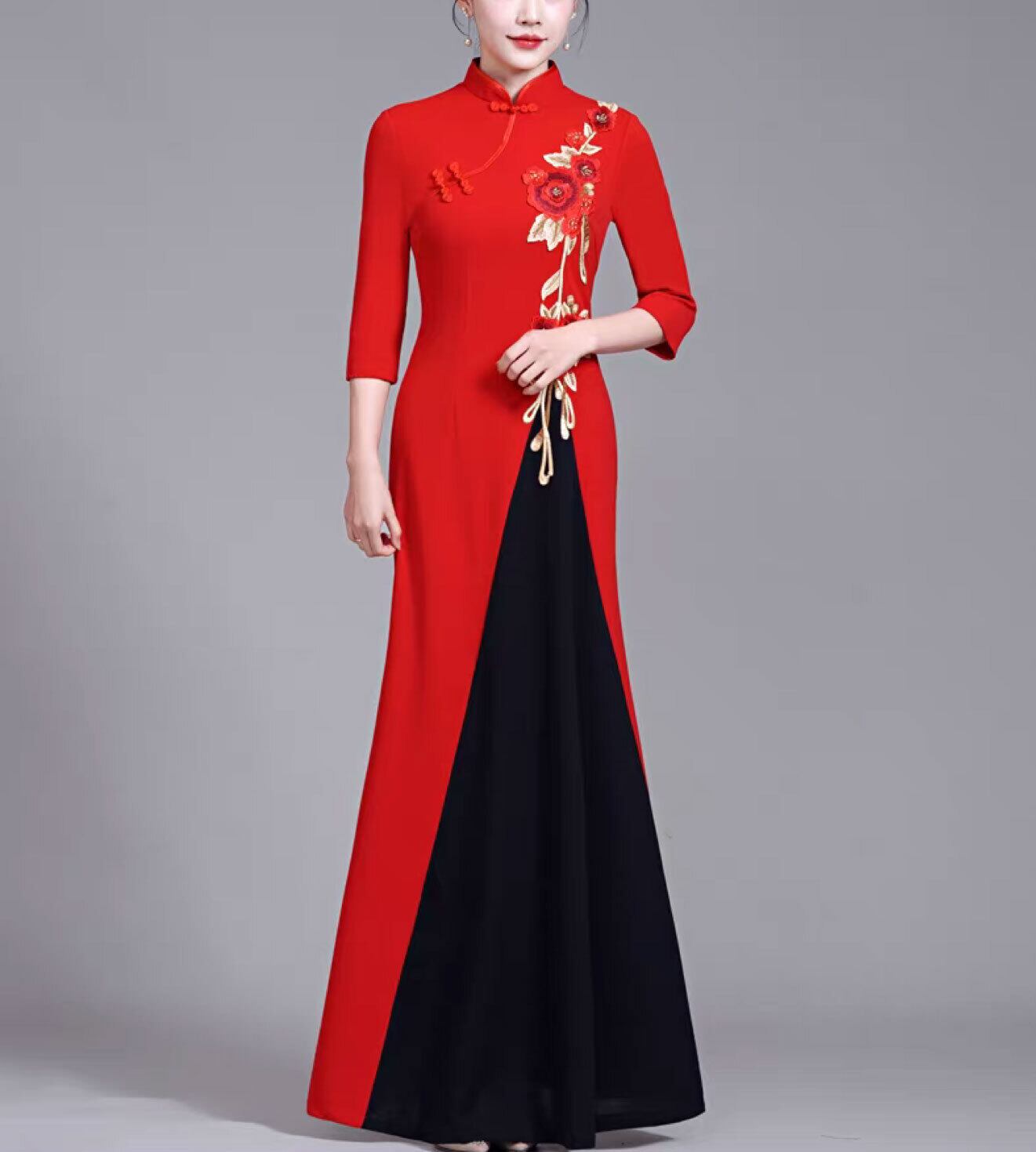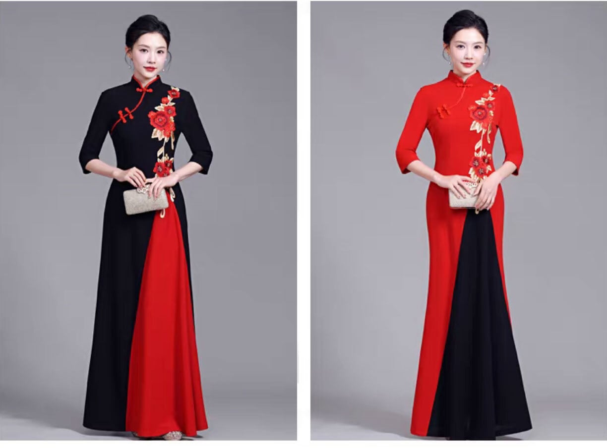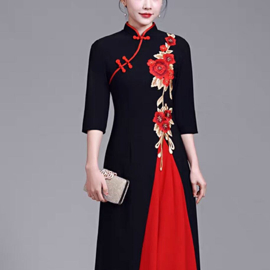 チャイナドレス ワンピース 赤黒バイカラー 七分袖 刺繍 マキシ丈 パーティードレス 中国衣装 zl493
