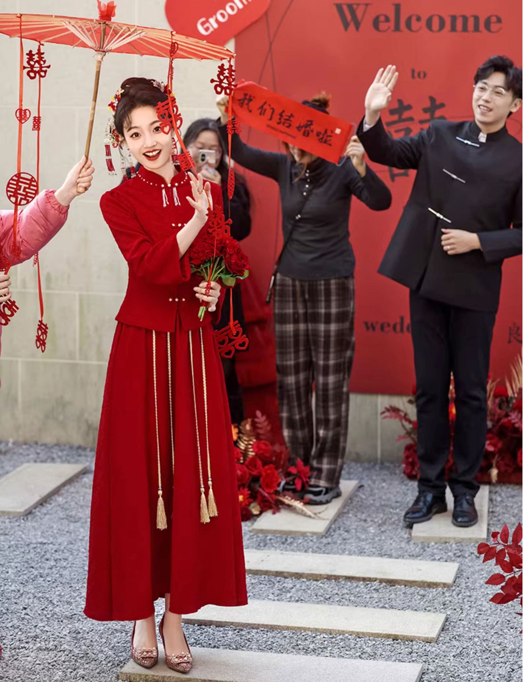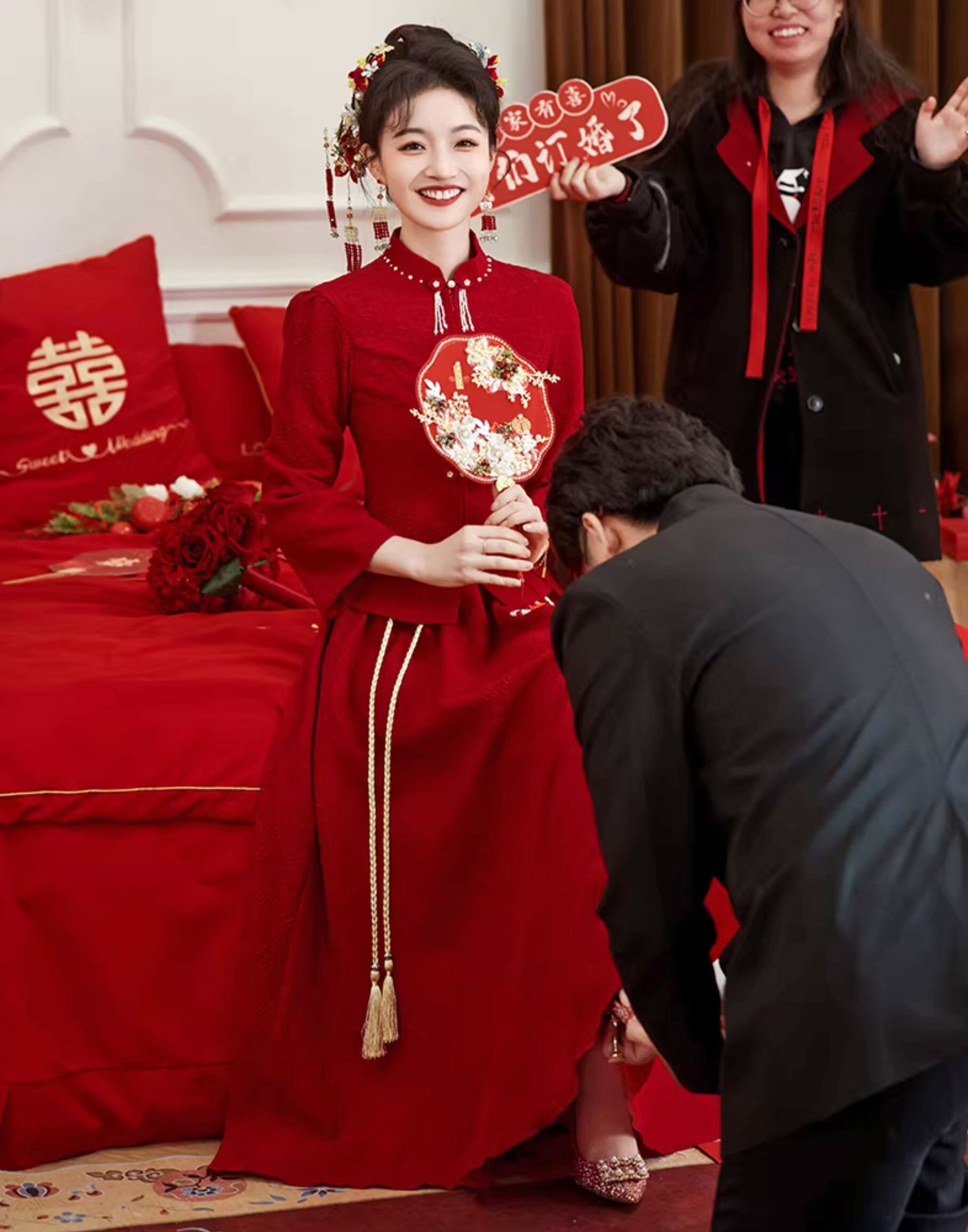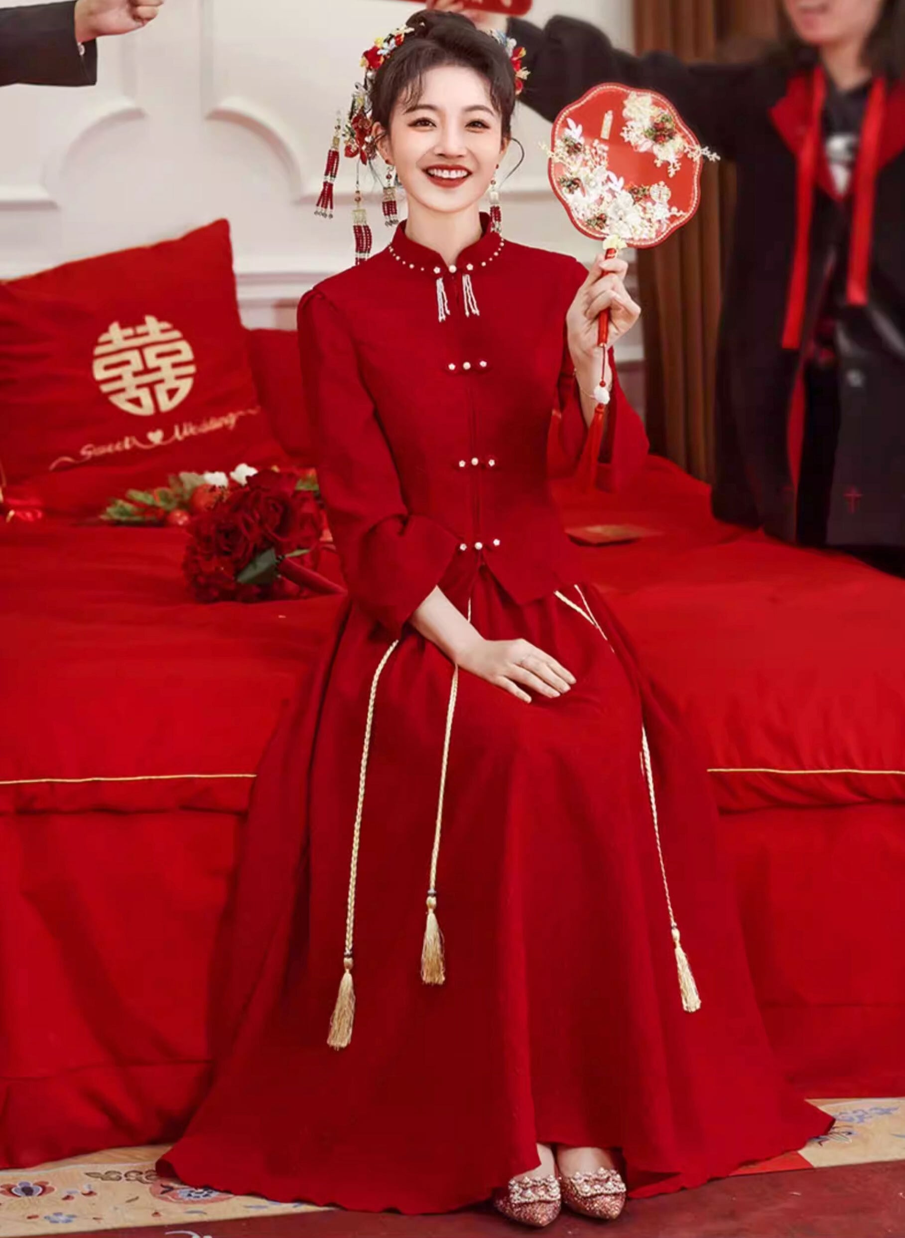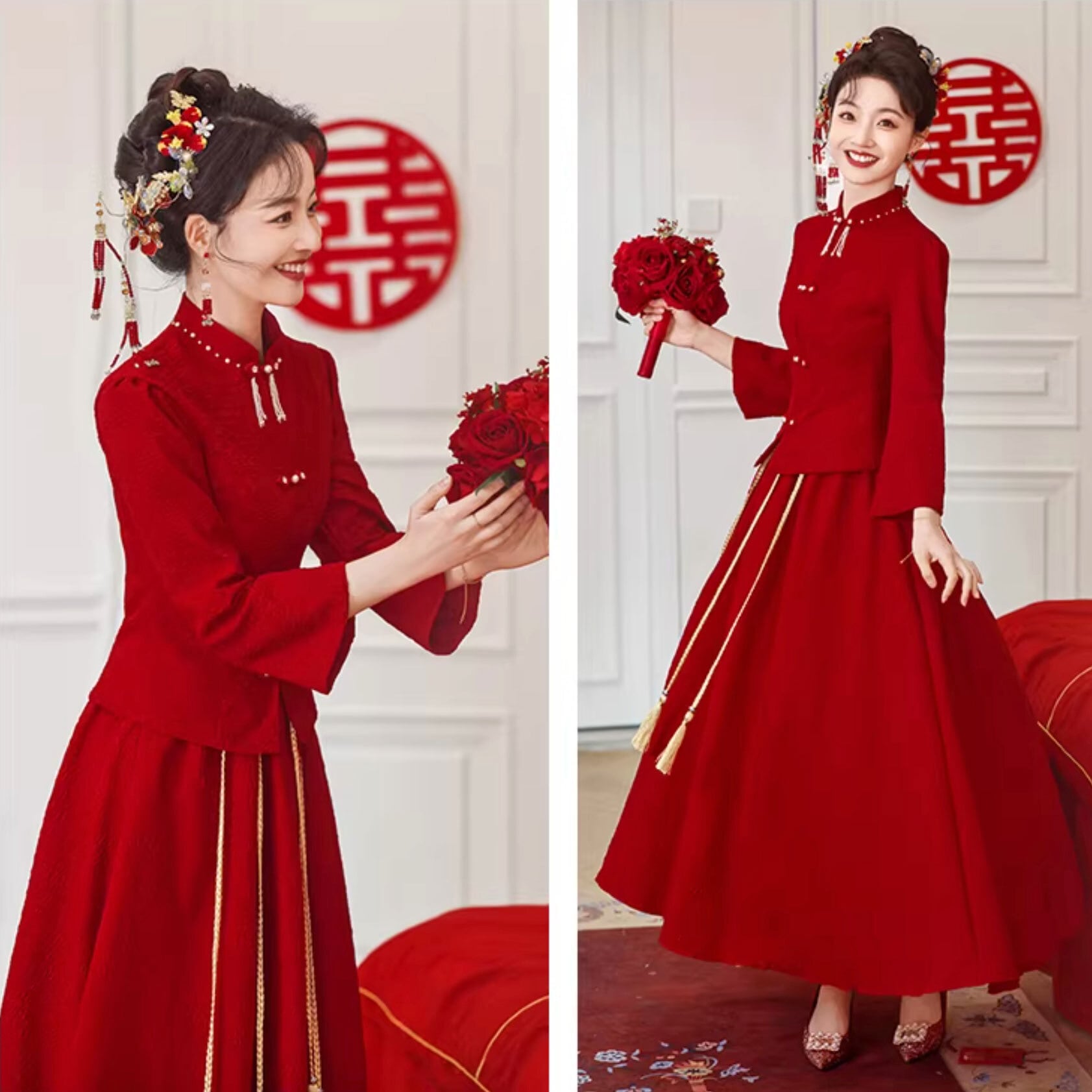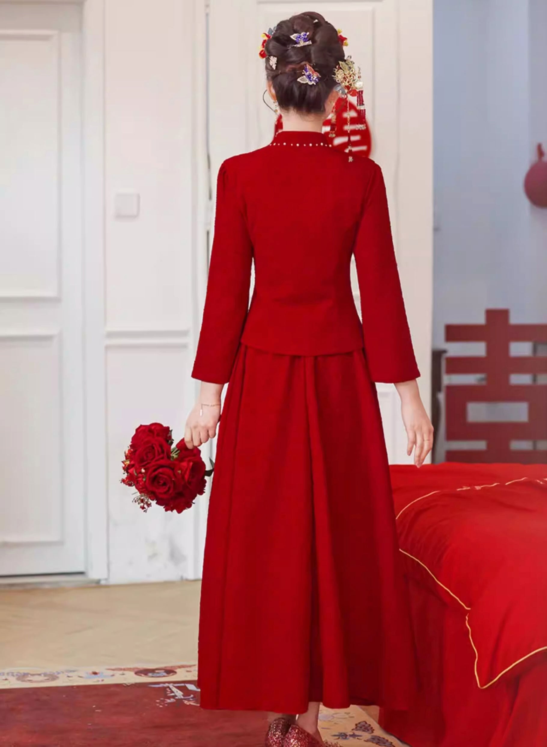 チャイナ服 トップス ロングスカート お得な上下セット レッド 長袖 zw92