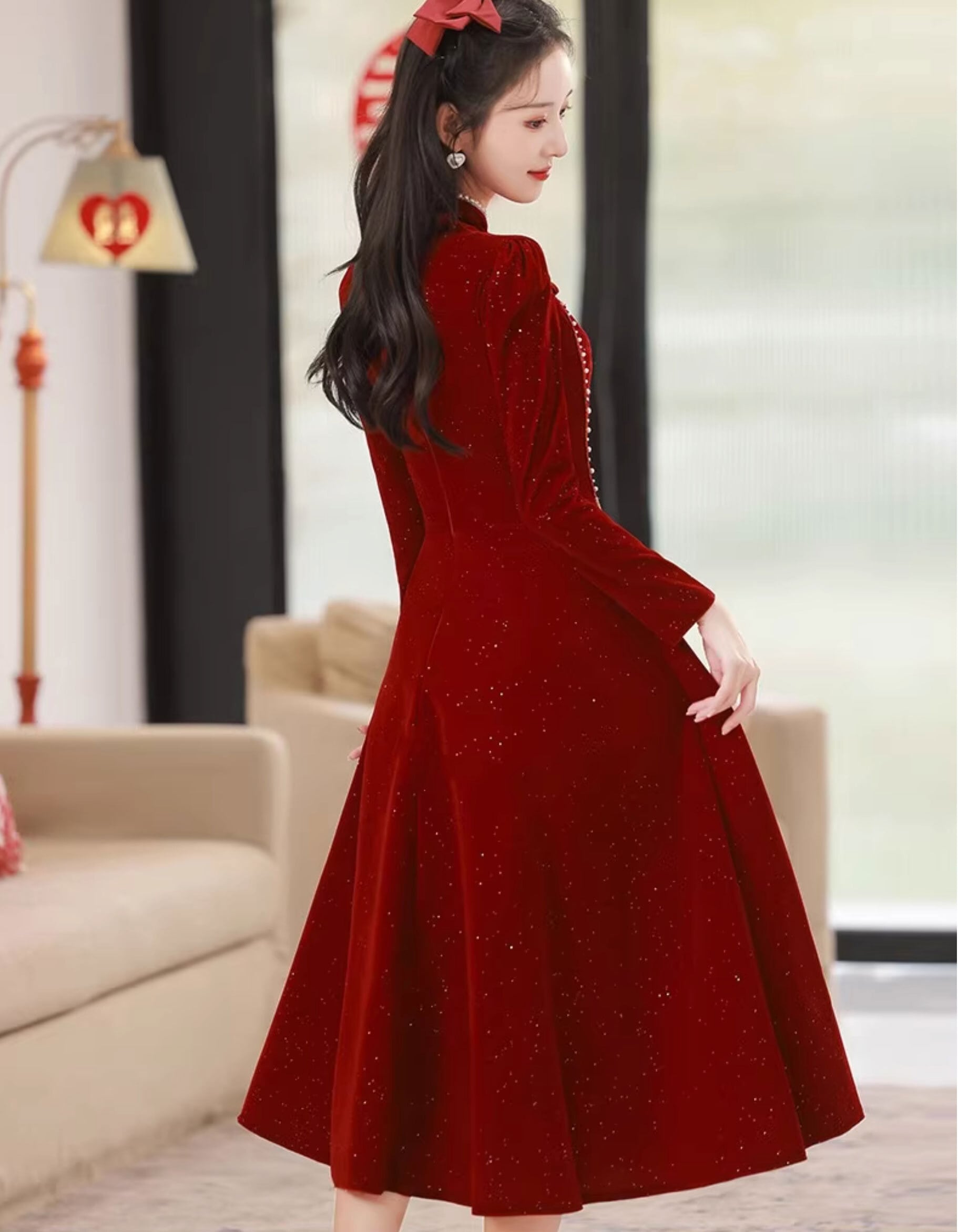 チャイナドレス ワンピース ラメ フェミニン 赤 長袖 ロング丈 パーティードレス 中国衣装 zl494