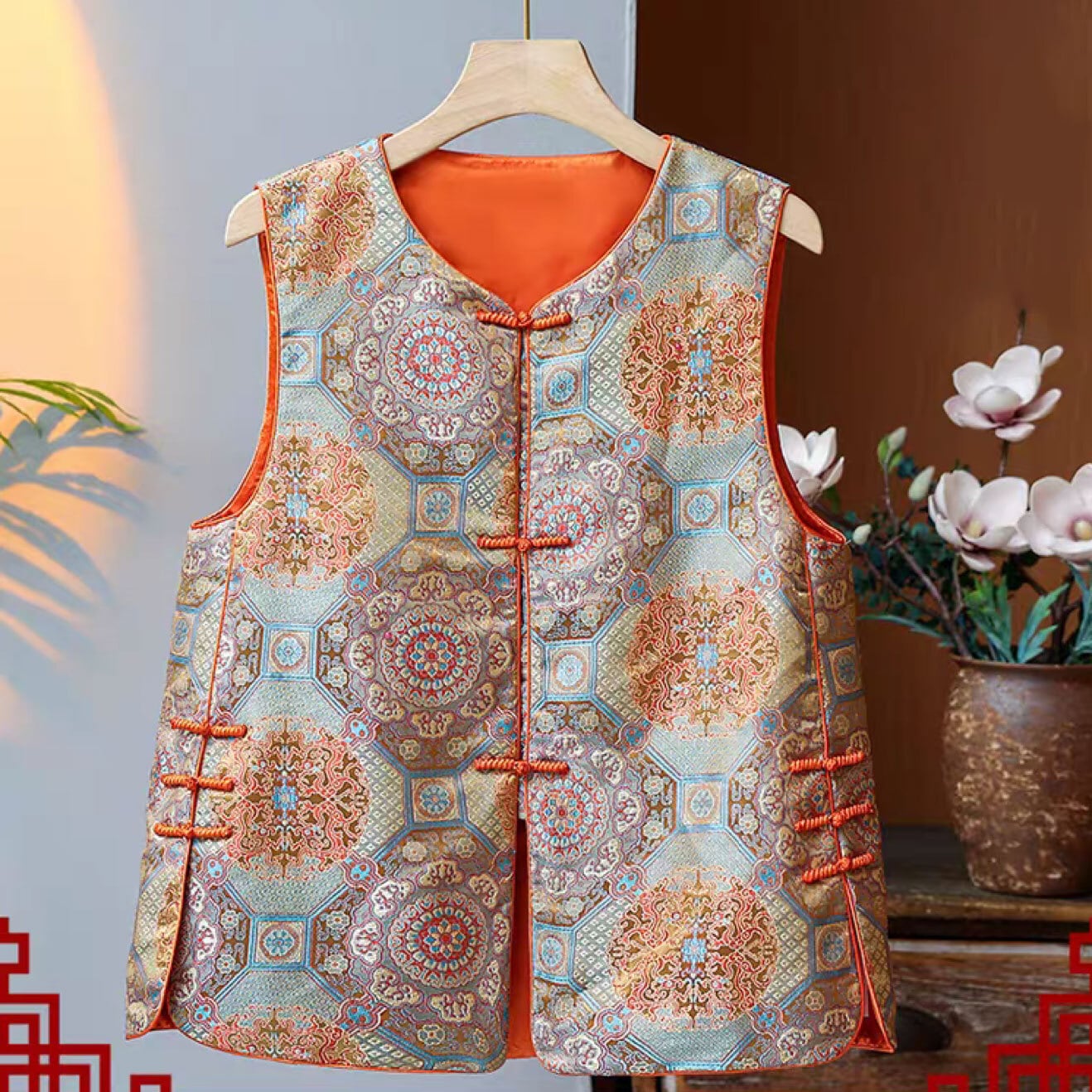 トップスも普段着も揃うチャイナ服専門店chaiです。こちらはチャイナ服 ベスト エレガント 総柄 上品な風合い ノースリーブ zv114の商品ページです。ツヤのある生地のおしゃれなチャイナベストで、チャイナファッションにちょうどよいアイテムです。