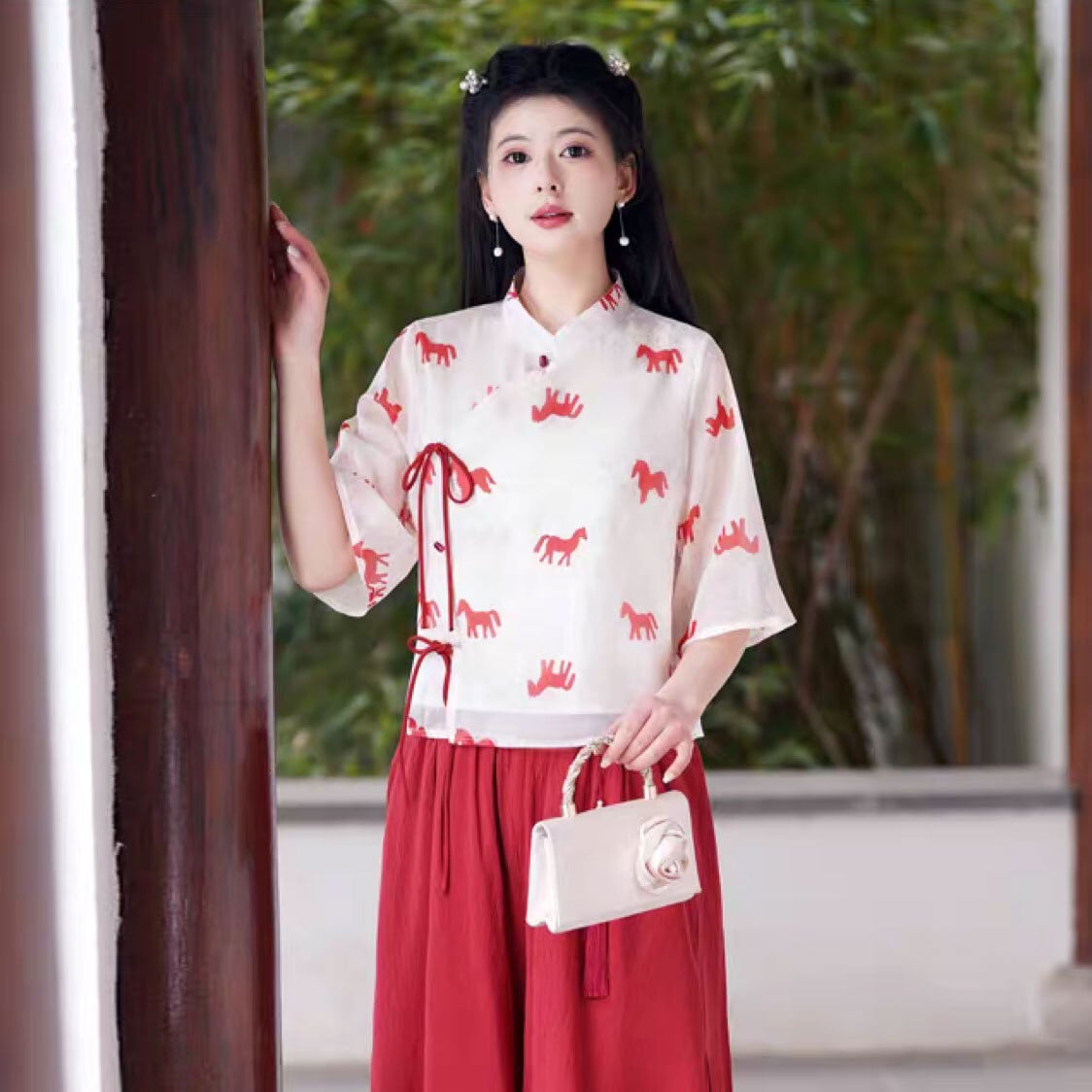 チャイナ服 トップス 春秋 五分袖 ウマシルエット 馬柄 フェミニンな風合い 普段着チャイナ服 二胡衣装 zh661