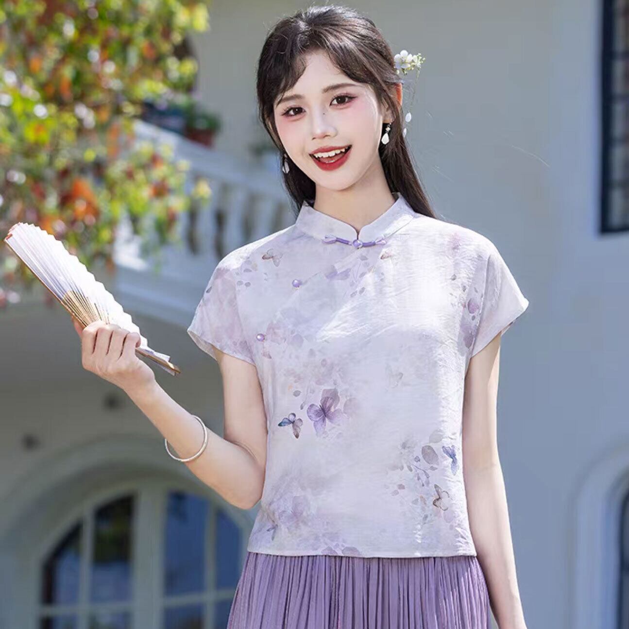 チャイナ服 トップス 春夏 半袖 薄紫 フェミニン 可愛い風合い 普段着チャイナ服 二胡衣装 zh665