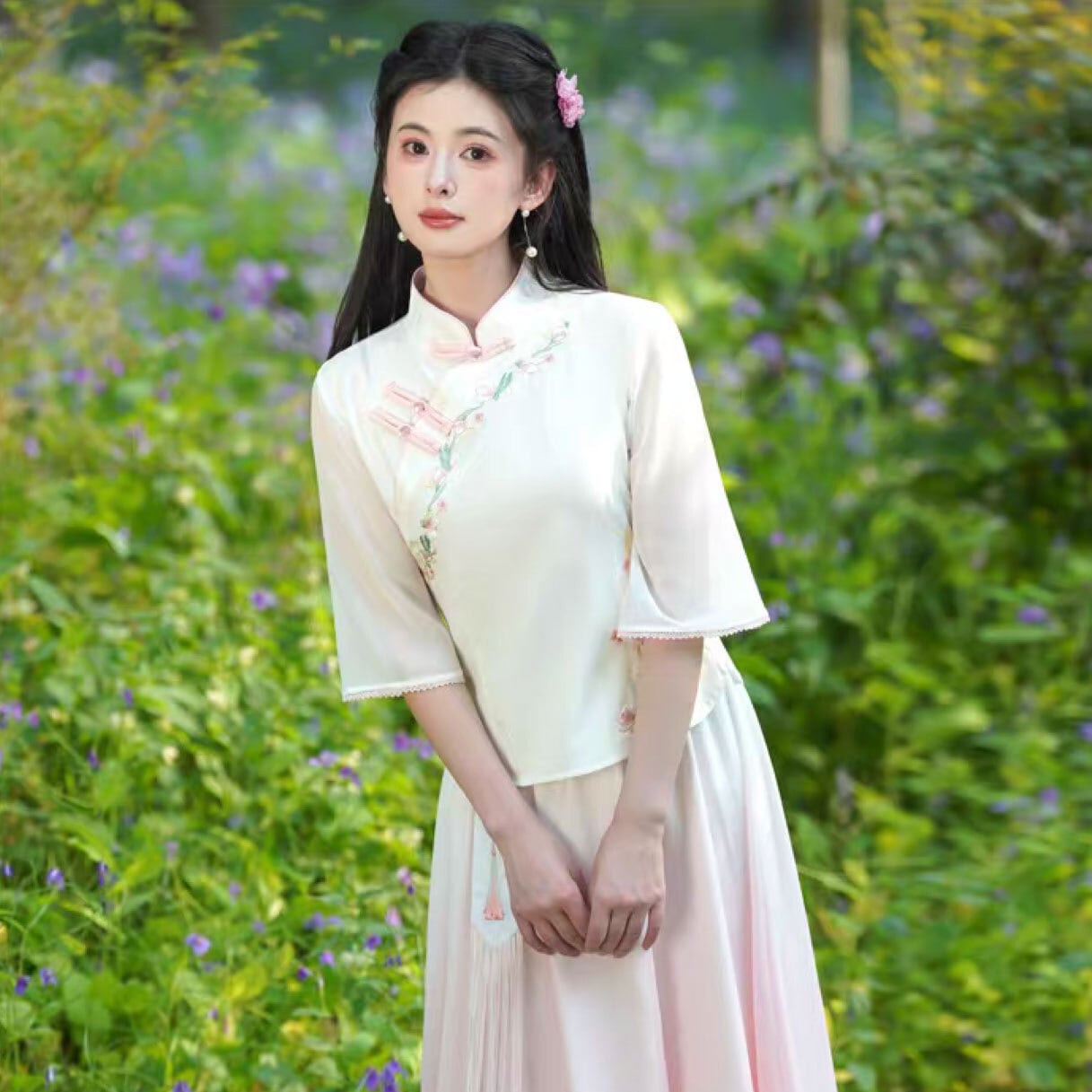 トップスも普段着も揃うチャイナ服専門店chaiです。こちらはチャイナ服 トップス 春夏 花柄刺繍 五分袖 フェミニン 可愛い風合い 普段着チャイナ服 二胡衣装 zh666の商品ページです。伝統的なチャイナボタンのディテールに、現代的なフェミニンさを掛け合わせた一着。