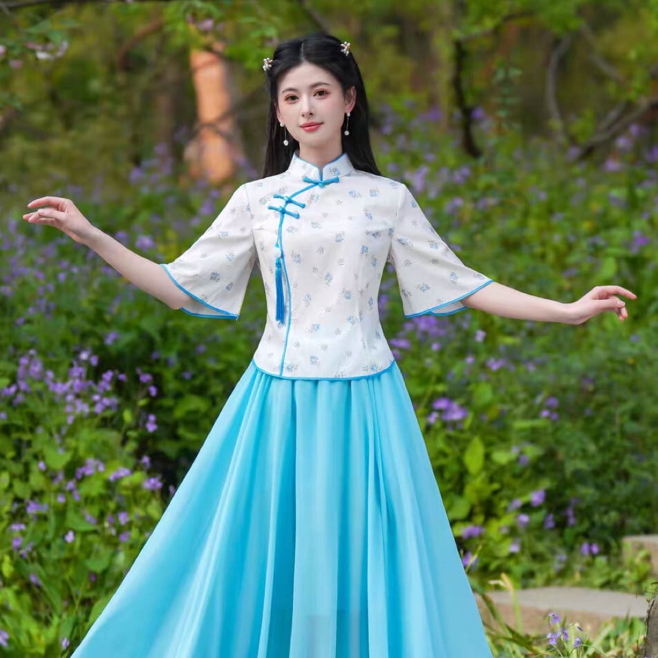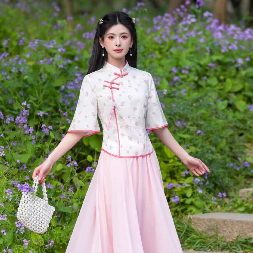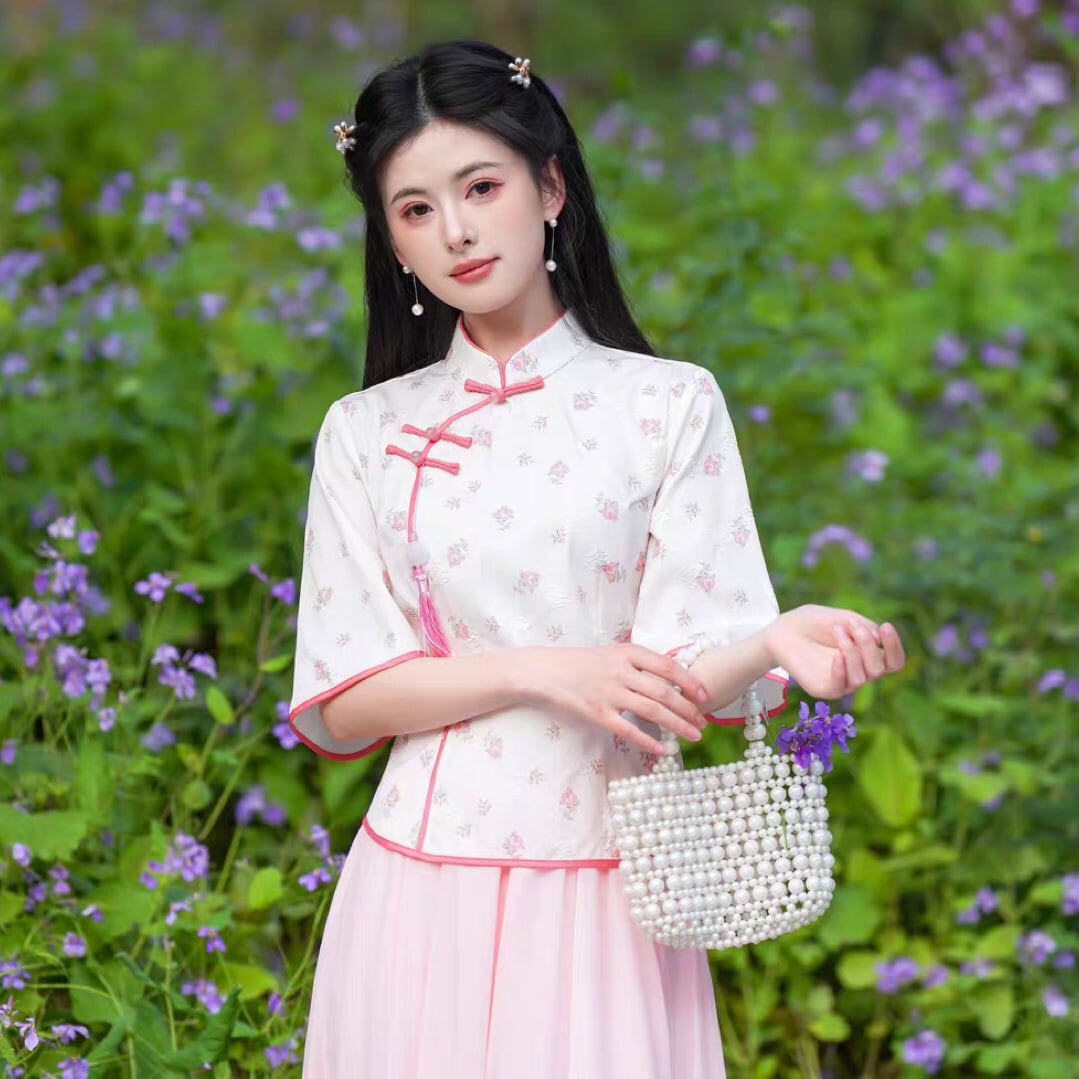 チャイナ服 トップス モダンチャイナ 小花柄ブラウス 春夏 五分袖 半袖 上品な風合い 二胡衣装 zh669