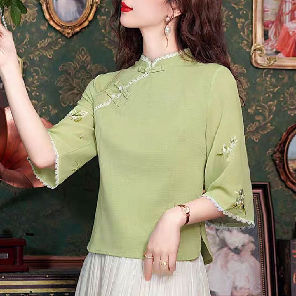 チャイナ服 トップス モダンチャイナ 刺繍シフォンブラウス 春夏 七分袖 上品な風合い 二胡衣装 zh670