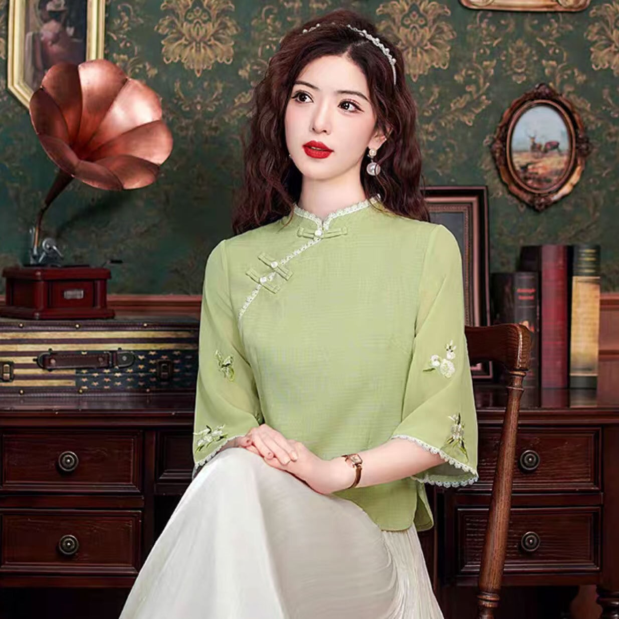 トップスも普段着も揃うチャイナ服専門店chaiです。こちらはチャイナ服 トップス モダンチャイナ 刺繍シフォンブラウス 春夏 七分袖 上品な風合い 二胡衣装 zh670の商品ページです。柔らかなシフォン生地に、繊細な刺繍が躍る一着。伝統的なチャイナカラー(立襟)を、レースの縁取りと控えめなパフスリーブで現代風にアップデートしました。