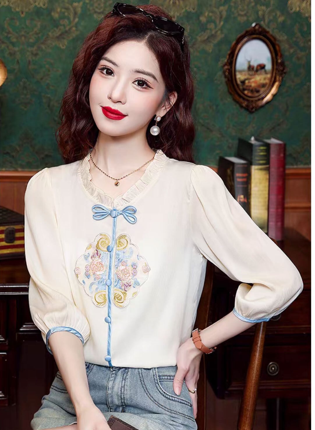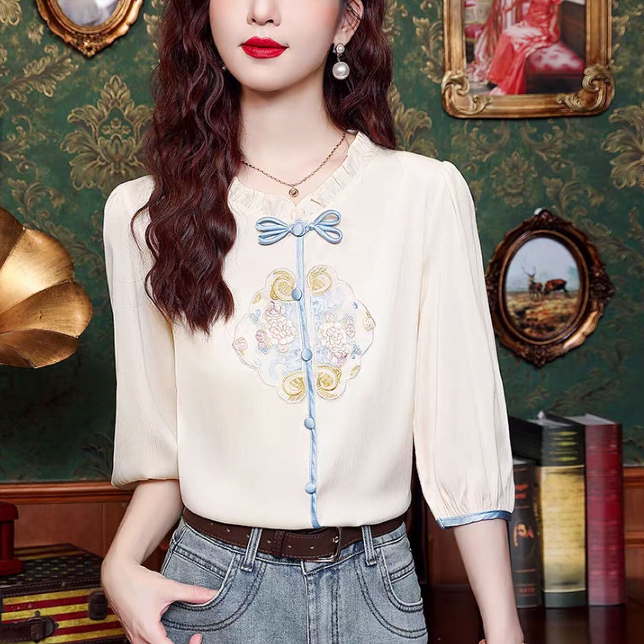 チャイナ服 トップス モダンチャイナ 刺繍シフォンブラウス 春夏 七分袖 上品な風合い 二胡衣装 zh671