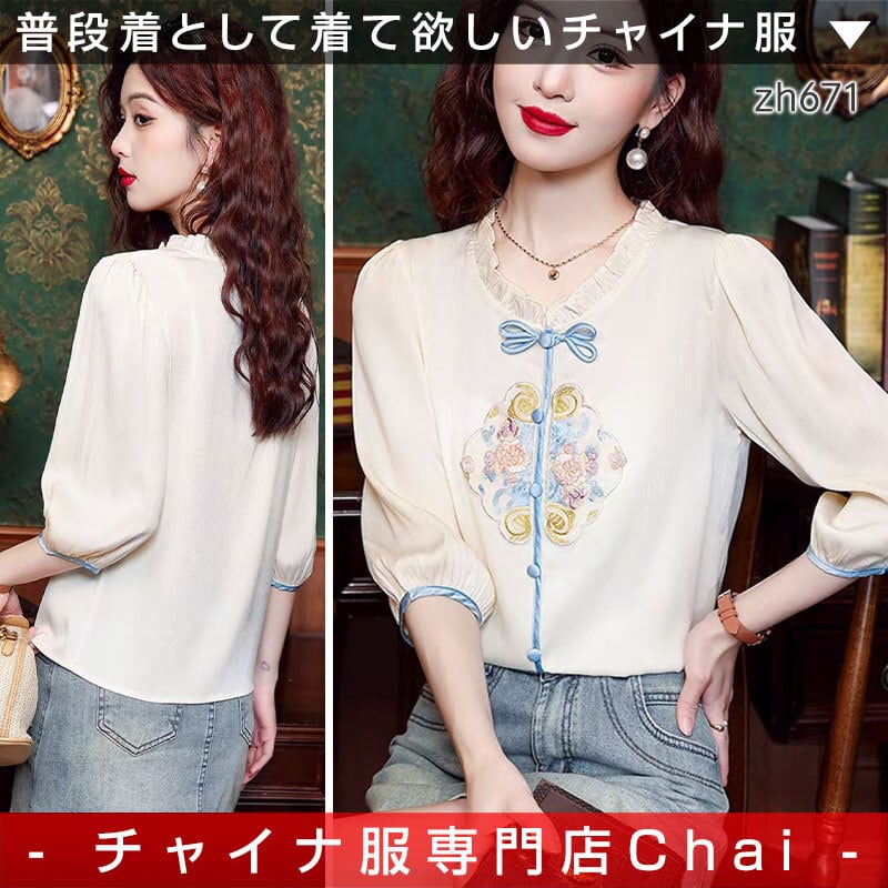トップスも普段着も揃うチャイナ服専門店chaiです。こちらはチャイナ服 トップス モダンチャイナ 刺繍シフォンブラウス 春夏 七分袖 上品な風合い 二胡衣装 zh671の商品ページです。柔らかなアイボリーに、ブルーのラインと繊細な花刺繍が映える一枚。