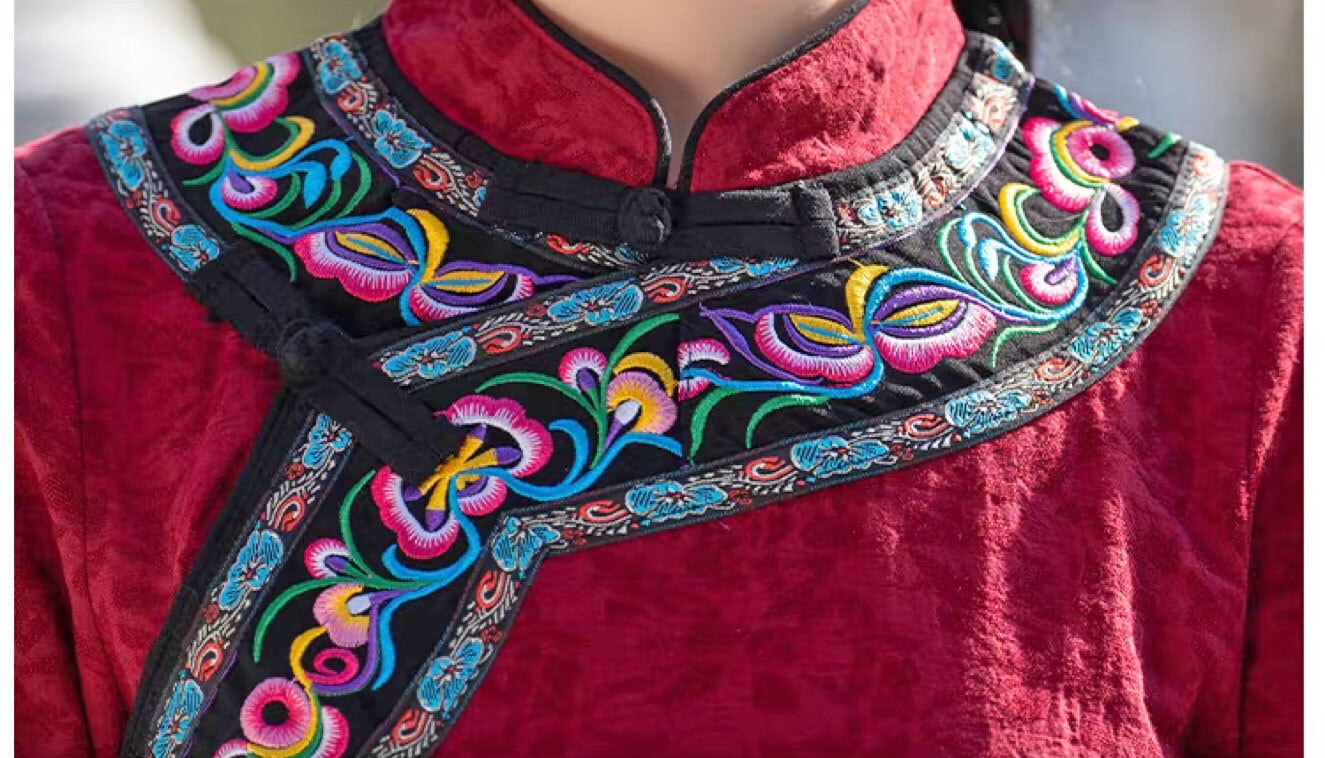目を引くのは、襟元から胸元にかけて施された緻密な刺繍デザイン。落ち着いた色味のボディに鮮やかな糸が映え、お顔周りをパッと明るく、華やかに演出してくれます。袖口や裾にも同様の刺繍を施すことで、どこから見ても抜かりのない完成された一着に仕上げました。