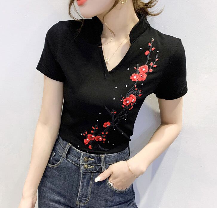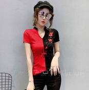 チャイナ服 半袖 バイカラー トップス 刺繍 花柄 カットソー チャイナトップス 民族 衣装 上品 本格 普段着 舞台 中国風 zh271