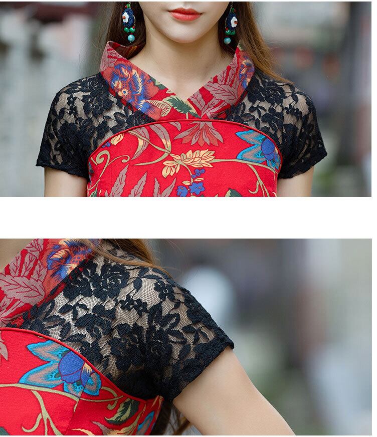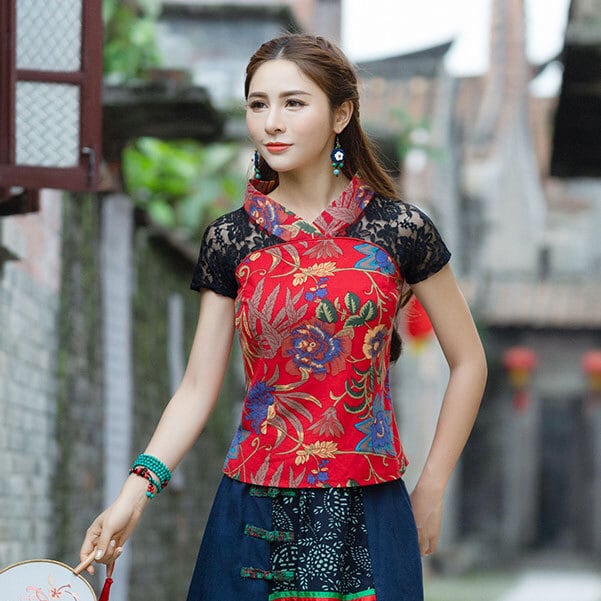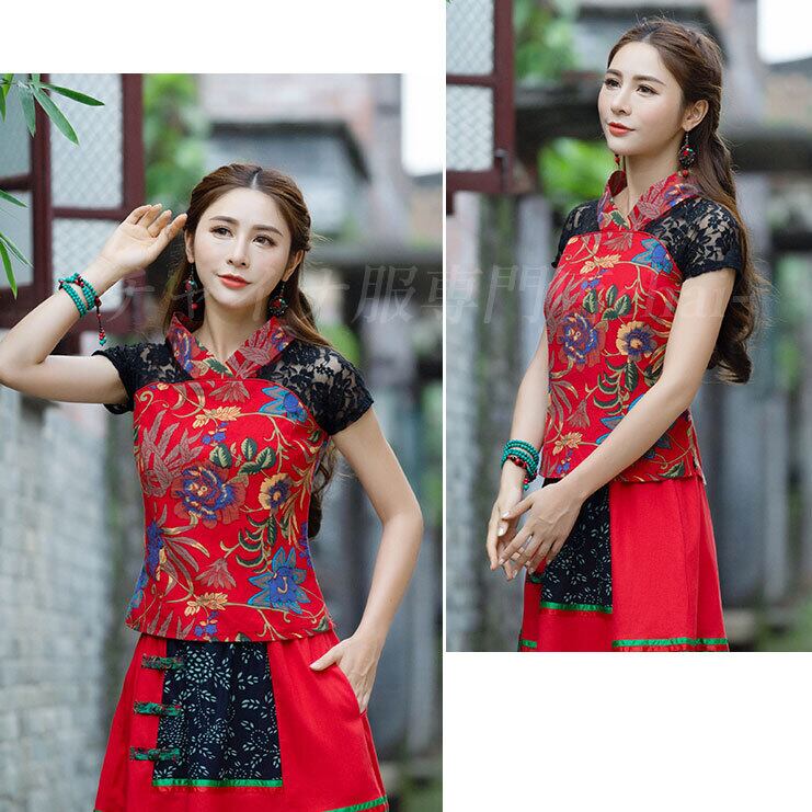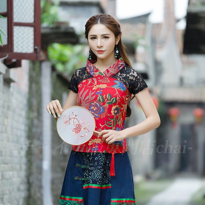 チャイナ服 トップス レース 半袖 花柄 カットソー チャイナトップス 民族 衣装 上品 本格 普段着 舞台 中国風 zh272