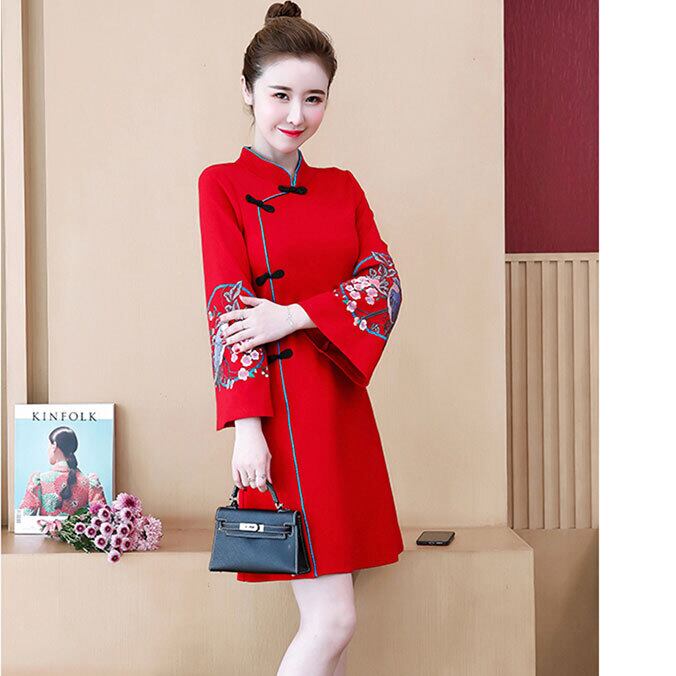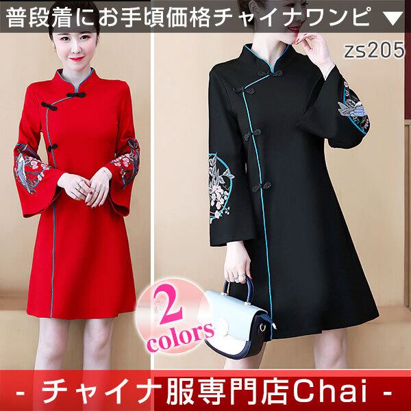 トップスも普段着も揃うチャイナ服専門店chaiです。こちらはチャイナ服 ワンピース 刺繍袖 2色 zs205の商品ページです。袖の刺繍が素敵なワンピースで、イベントごとや普段着でも使えるアイテムです。