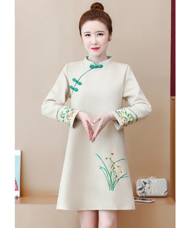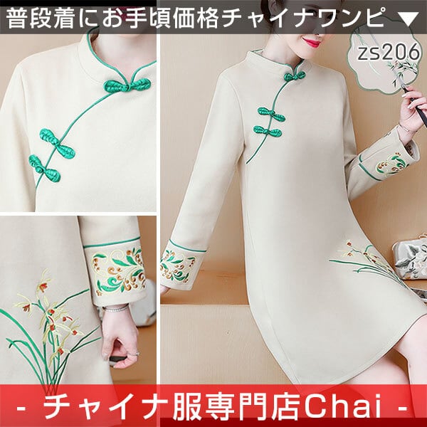 トップスも普段着も揃うチャイナ服専門店chaiです。こちらはチャイナ服 ワンピース 刺繍袖 チャイナボタン zs206の商品ページです。袖の刺繍が素敵なワンピースで、イベントごとや普段着でも使えるアイテムです。