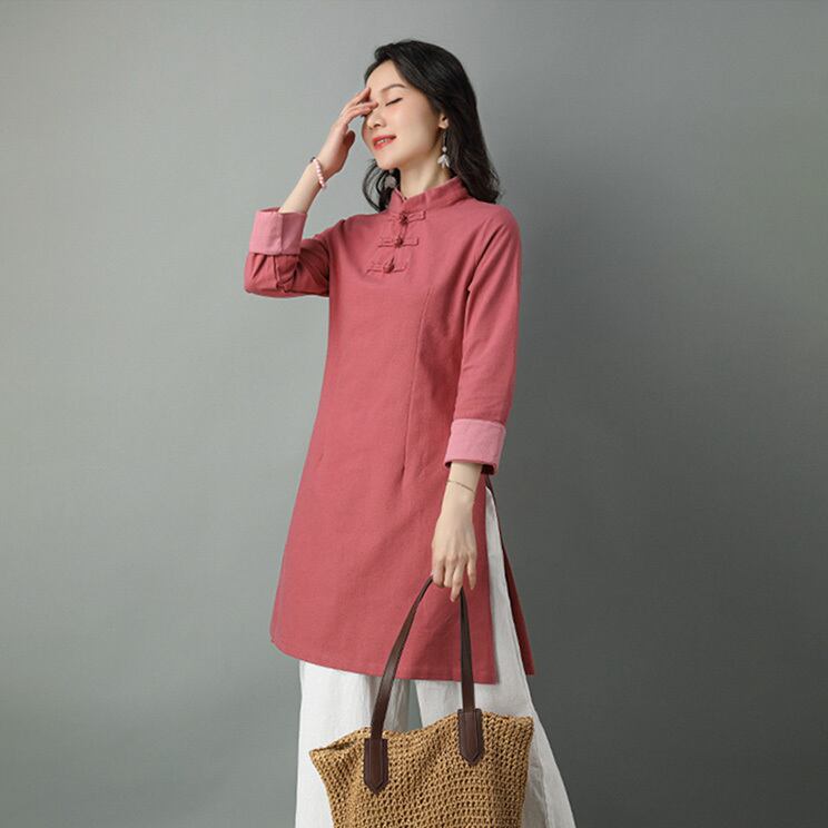 トップスも普段着も揃うチャイナ服専門店chaiです。こちらはチャイナ服 普段着 ロング丈トップス 落ち着いた風合い 長袖 zt342の商品ページです。落ち着いた風合いが素敵な丈長めのチャイナトップスで、袖をロールアップしてもお洒落なアイテムです。