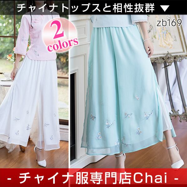 トップスも普段着も揃うチャイナ服専門店chaiです。こちらはチャイナ服 ワイドパンツ シフォン 普段着チャイナ zb169の商品ページです。シフォンのゆったりしたシルエットのチャイナパンツで、春夏に普段着でも使いやすいアイテムです。
