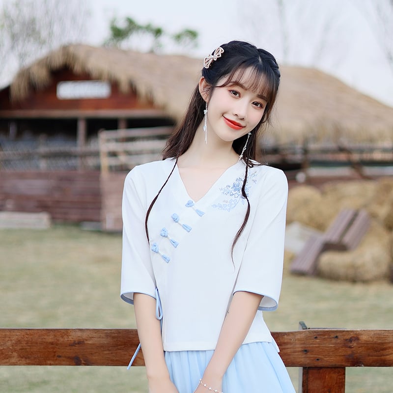 チャイナトップス 普段着 可愛いモダンチャイナ 刺繍 Vネック zh347