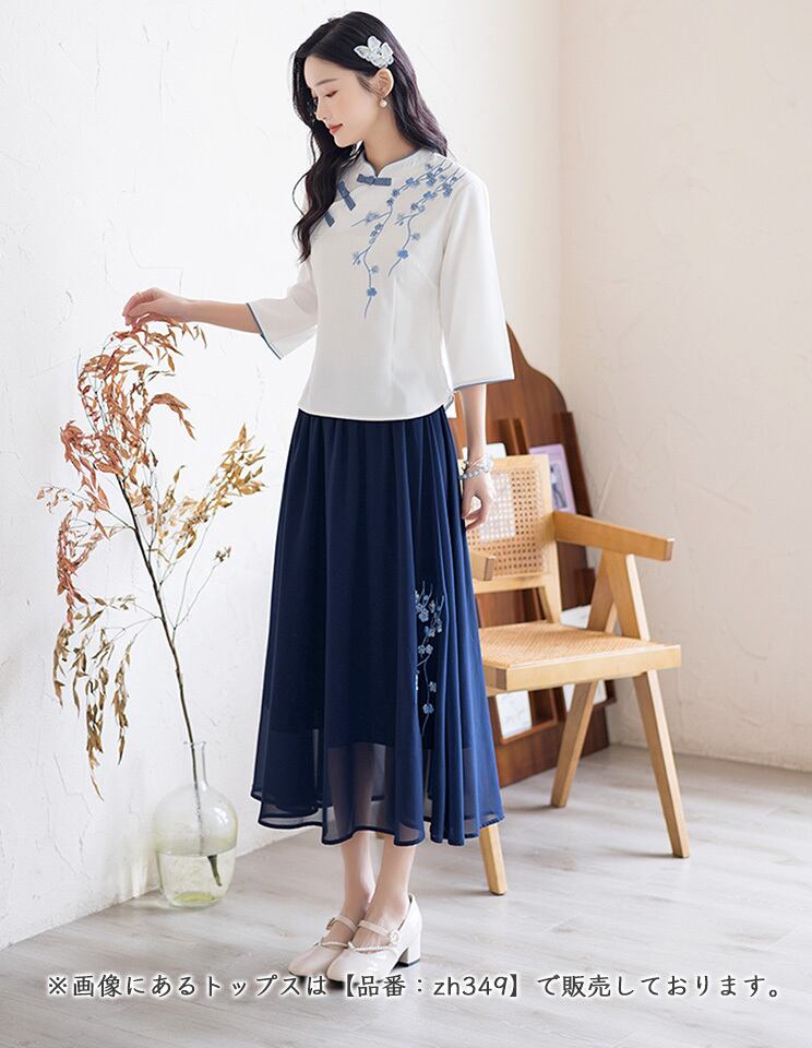 トップスも普段着も揃うチャイナ服専門店chaiです。こちらはチャイナ服 シフォンスカート Aライン 普段着チャイナ zq71の商品ページです。シフォンのチャイナスカートで、春夏のチャイナトップスと合わせるのにぴったりのアイテムです。画像にあるトップスは【品番:zh349】で販売しております。