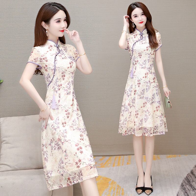 チャイナ服 普段着 花柄シフォンワンピ 半袖 2色 zs222