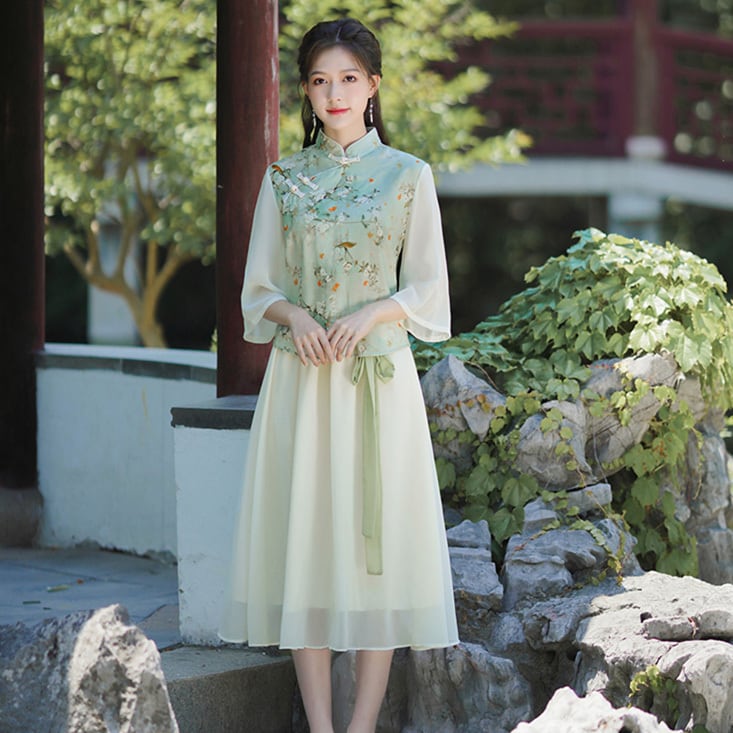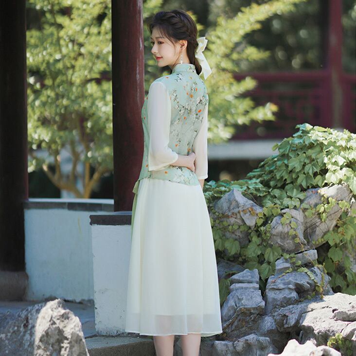 チャイナ服 トップス シフォンスリーブ シャツ 花柄 チャイナボタン zh368